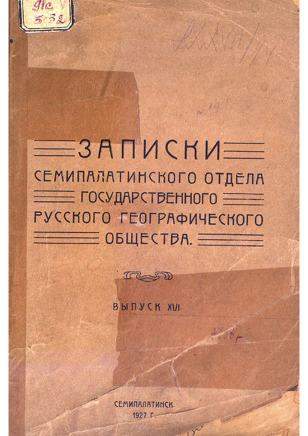 Записки Семипалатинского отдела государственного русского географического общества [Текст] ; Русское географическое общество .- Семипалатинск ; Алматы : Семгубиздат , 1927.– 370 экз. . Вып. 16 .– 193 с.