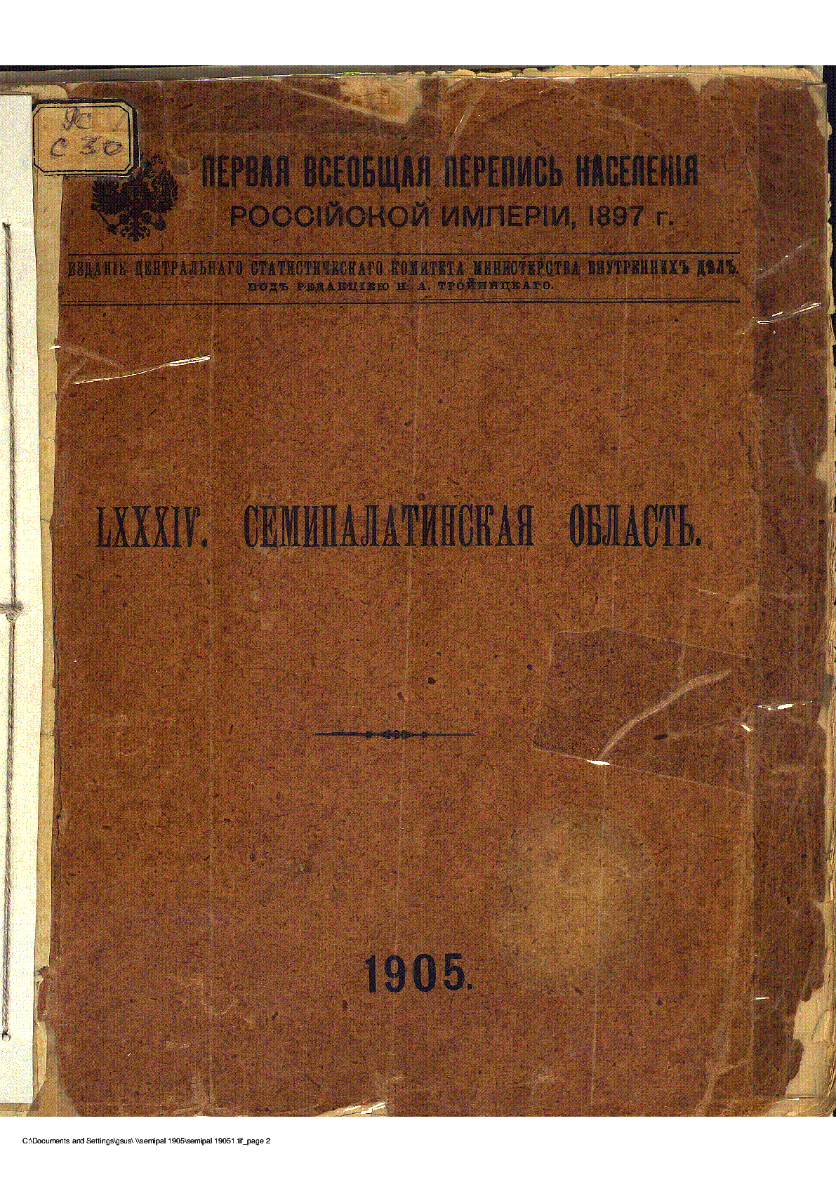 Семипалатинская область [Текст] : Первая всеобщая перепись населения Российской империи, 1897 г. ; под ред. Н. А. Тройницкого . – Издание центрального статистического комитета министерства внутренних дел ,- [Б. м.] : Тип. кн. В. П. Мещерскаго , 1905.– [б. т.] . Т. LXXXIV .– 148 с., табл. . : 40 тг.
