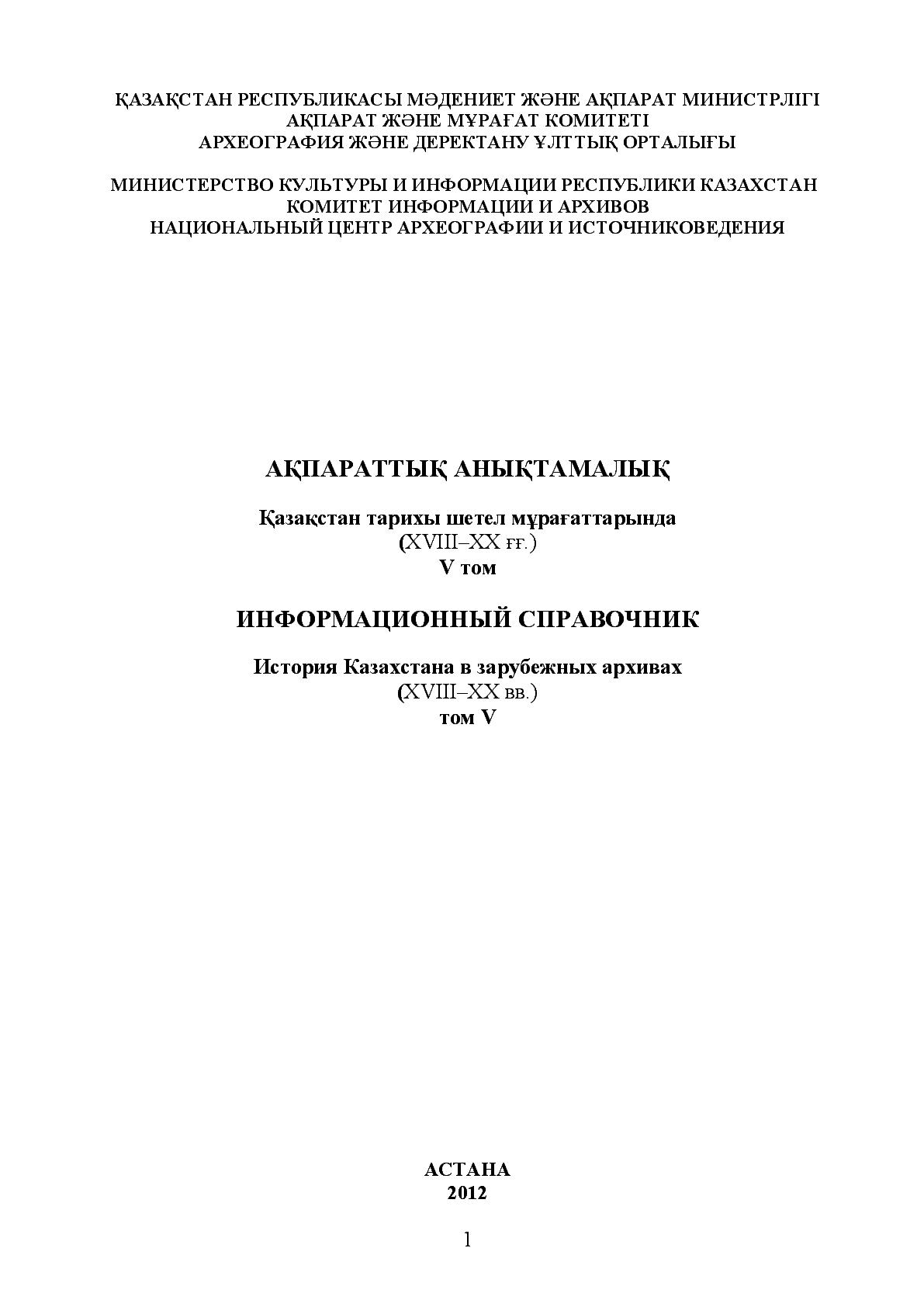 История Казахстана в зарубежных архивах (XVIII - XX вв.) [Текст] : информационный справочник ; [сост.: Б. Т. Жанаев [и др.] ; Министерство культуры и информации Республики Казахстан, Комитет информации и архивов ; Национальный центр археографии и источниковедения]- Астана : [б. и.] , 2012. – 9965-23-192-3 (в пер.) Т. 5 .– 402 c.