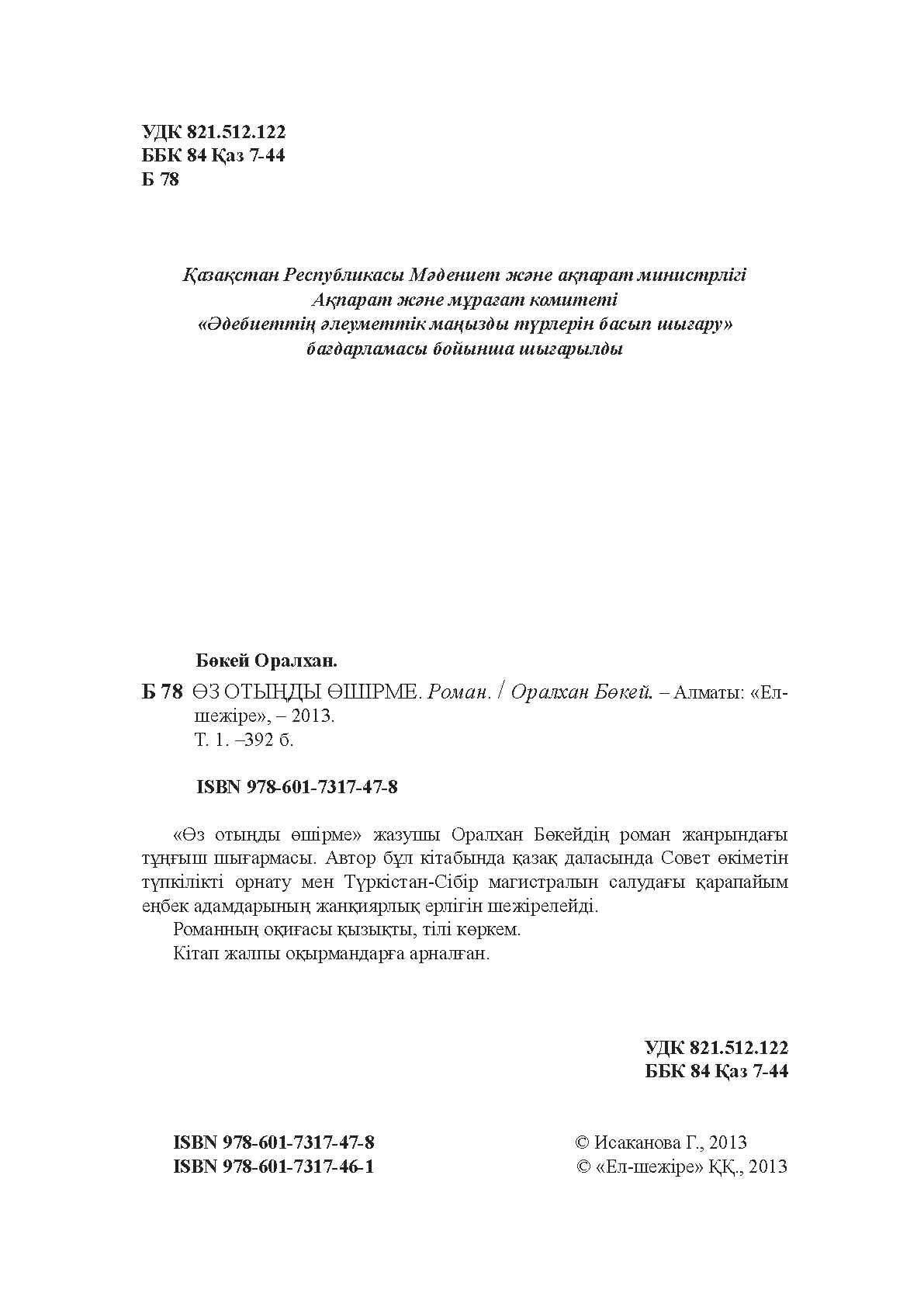 Шығармалары [Мәтін] / О. Бөкей- Алматы : Ел-шежіре , 2013.– 2000 дана . – 978-601-7317-47-8 (1-т.), 978-601-7317-46-1 (мұқ.) - ҚР Мәдениет және ақпарат министрлігі, Ақпарат және мұрағат комитеті "Әдебиеттің әлеуметтік маңызды түрлерін басып шығару" бағдарламасы бойынша шығарылды . 1-т. .– 391 б., портр. . (мұқ.) : 1000 тг.