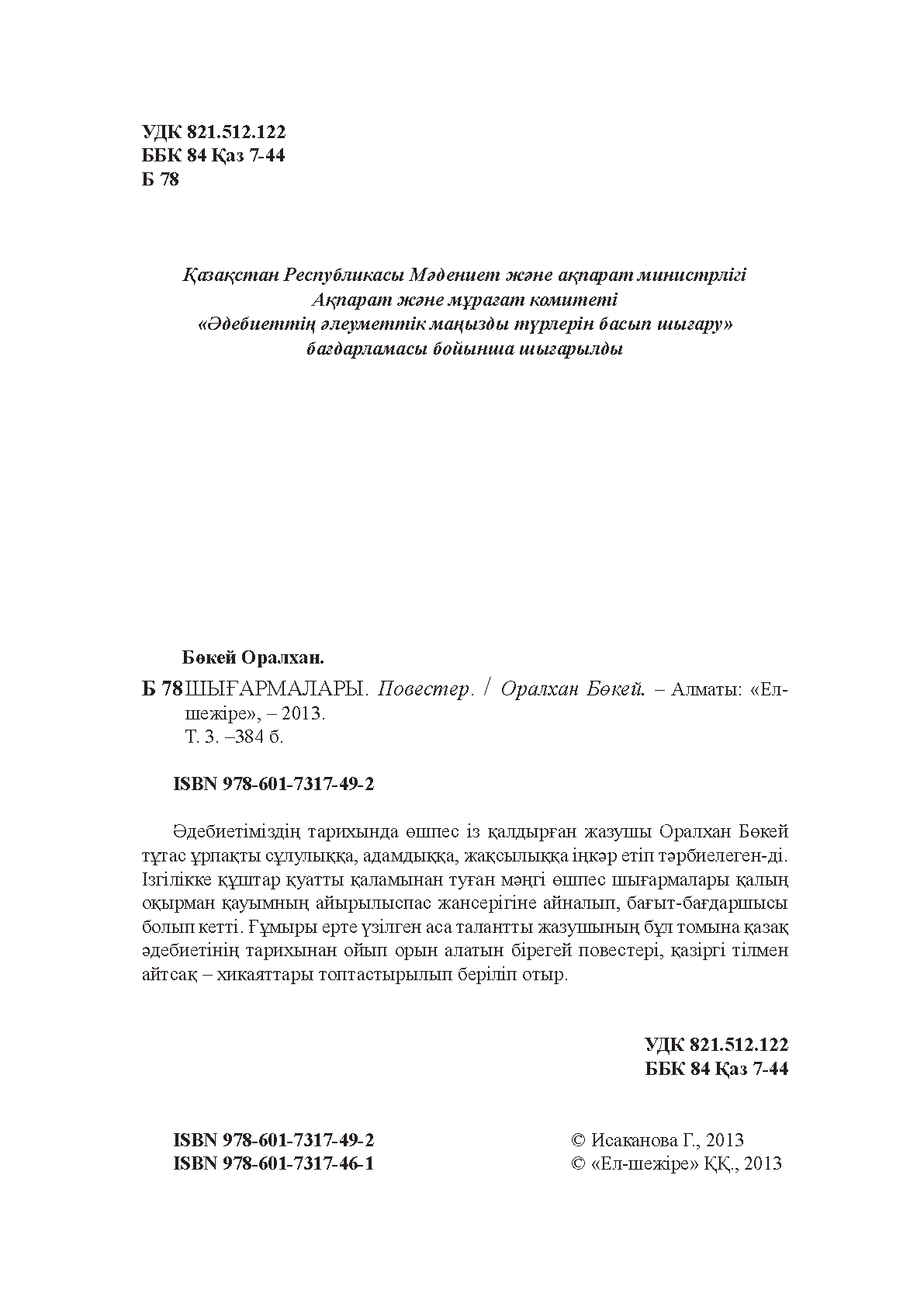 Шығармалары [Мәтін] / О. Бөкей- Алматы : Ел-шежіре , 2013.– 2000 дана . – 978-601-7317-49-2 (3-т.), 978-601-7317-46-1 (мұқ.) - ҚР Мәдениет және ақпарат министрлігі, Ақпарат және мұрағат комитеті "Әдебиеттің әлеуметтік маңызды түрлерін басып шығару" бағдарламасы бойынша шығарылды . 3-т. . Повестер– 383 б., портр. . (мұқ.) : 1000 тг.