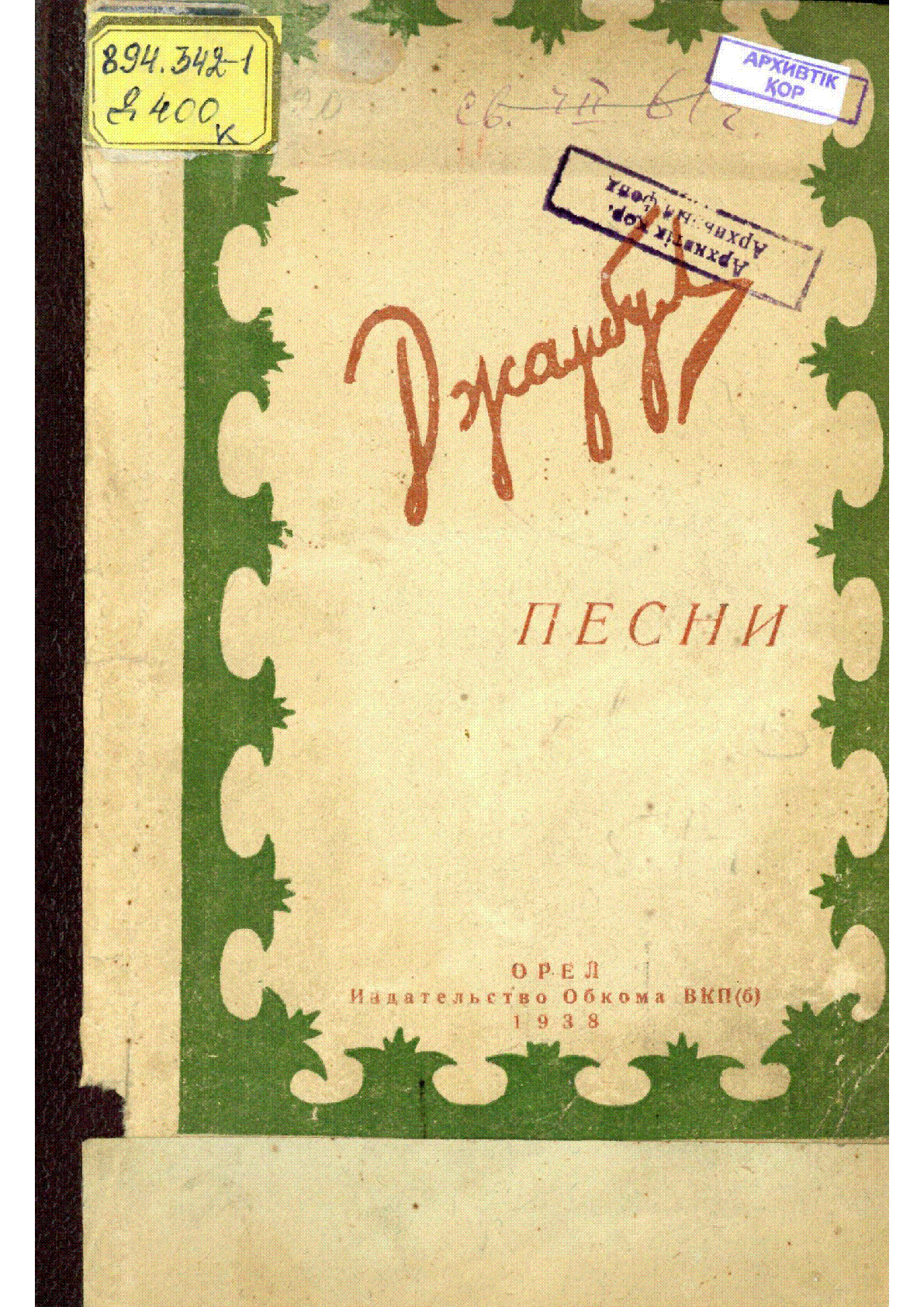 Песни [Текст] / Д. Джабаев ; пер. с казахского К. Алтайского, П. Кузнецова, К. Симонова... – Орел : Изд-во обкома ВКП(б), 1938. - 94, [2] c. . . – 7000 экз.