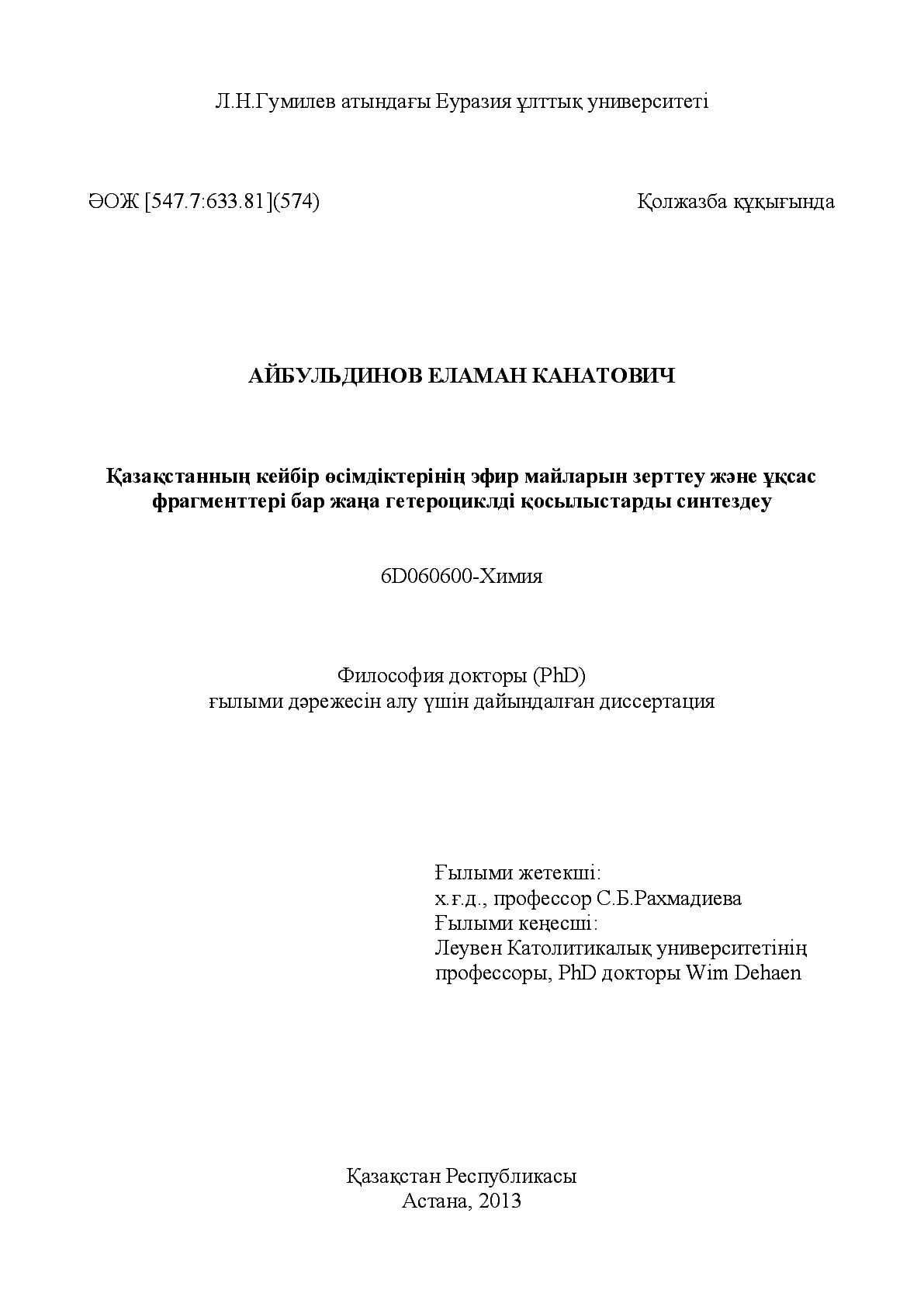 Қазақстанның кейбір өсімдіктерінің эфир майларын зерттеу және ұқсас фрагменттері бар жаңа гетероциклді қосылыстарды синтездеу [Электрондық ресурстар], [Электрондық ресурстар] : философия докторы (PhD) ғылыми дәрежесін алу үшін дайындалған диссертация : 6D060600 - Химия / Е. К. Айбульдинов ; ғылыми жетекші: С. Б. Рахмадиева, W. Dehaen... – Астана : [б. ж.], 2013. - 126 б., 1 электрон опт. диск (CD-ROM); . – Библиогр.: 101-119 б. . – [т. ж.] – көрсетілмеген : 200 тг.