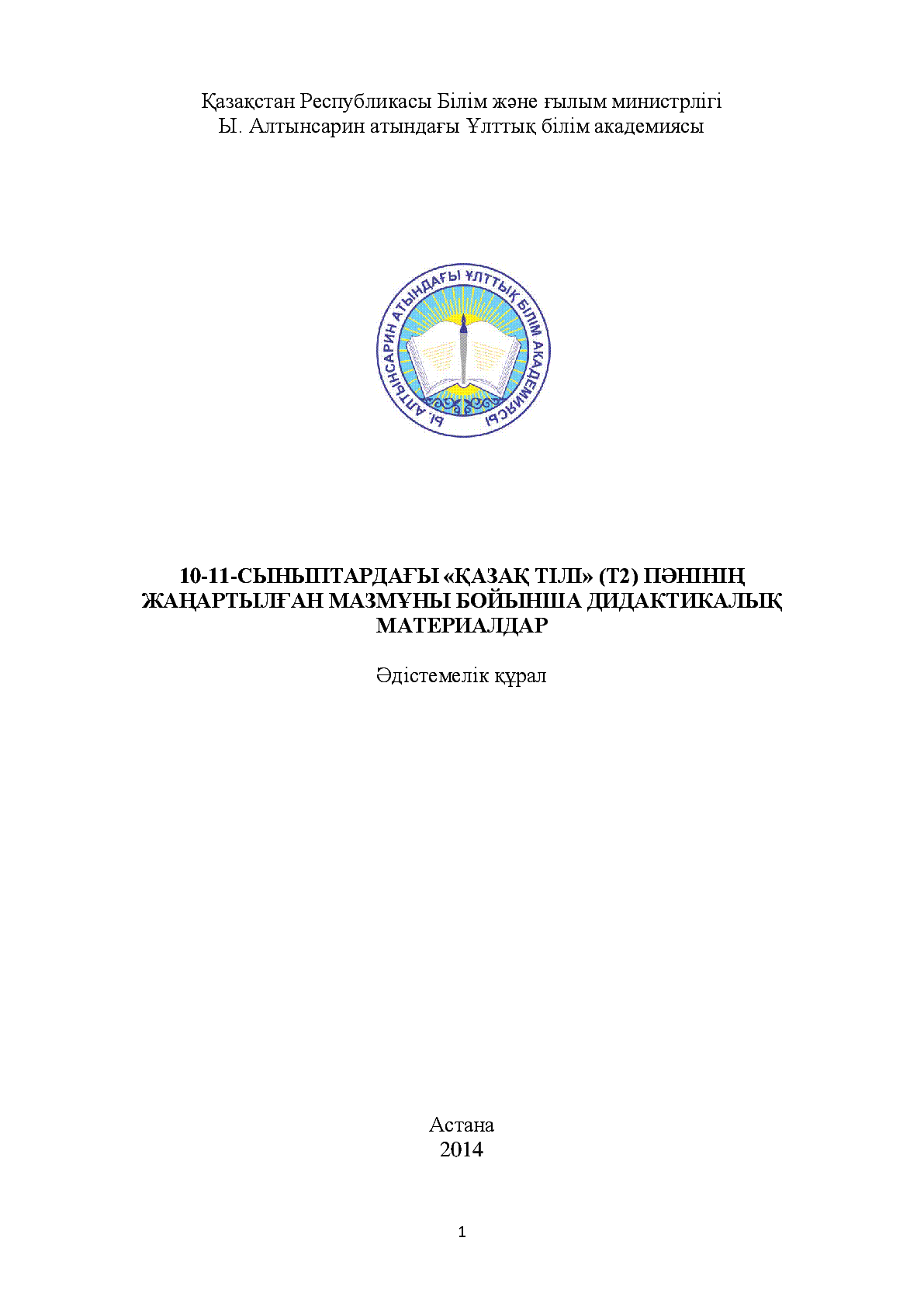 10-11 - сыныптардағы "Қазақ тілі" (Т 2) пәнінің жаңартылған мазмұны бойынша дидактикалық материалдар [Text] : Әдістемелік құрал / ... – Астана : [б. ж.], 2014. - 64 б. 64 б. 65 б., суретті; . – Библиогр.: 62-63 б. . – [Т. ж.] – көрсетілмеген : [б. ж.]