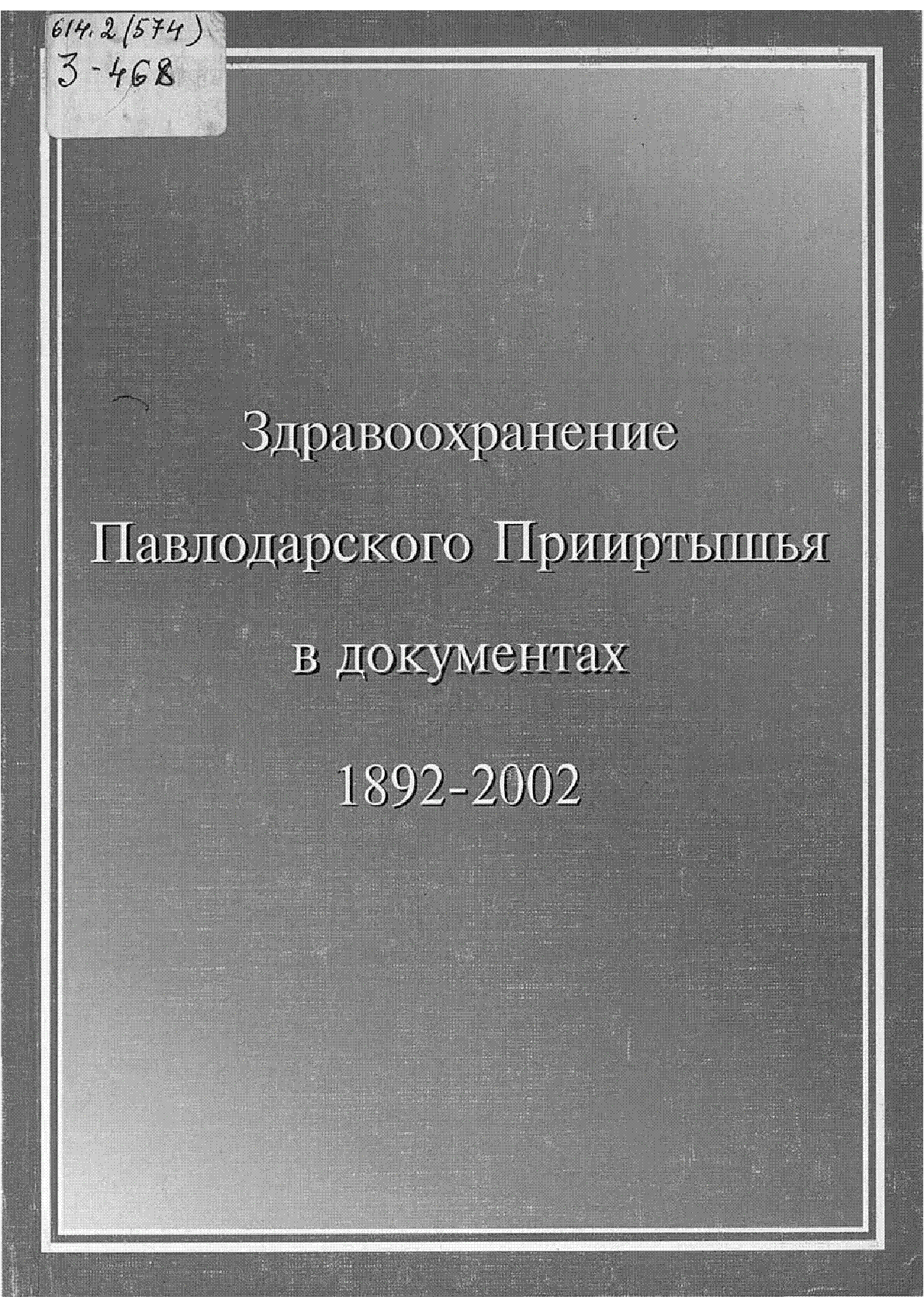 Здравоохранение Павлодарского Прииртышья в документах [Text] : сборник документов 1892-2002 годы / ; [сост.: В. Д. Болтина, Л. В. Шевелева]... – Павлодар : ЭКО, 2002. - 632 с., [8] л. ил., ил.; . – Имен. указ.: с. 583-593 ; Географ. указ.: с. 594-604 . – 300 экз. – 9965-568-65-7 (в пер.) : 45 тг.