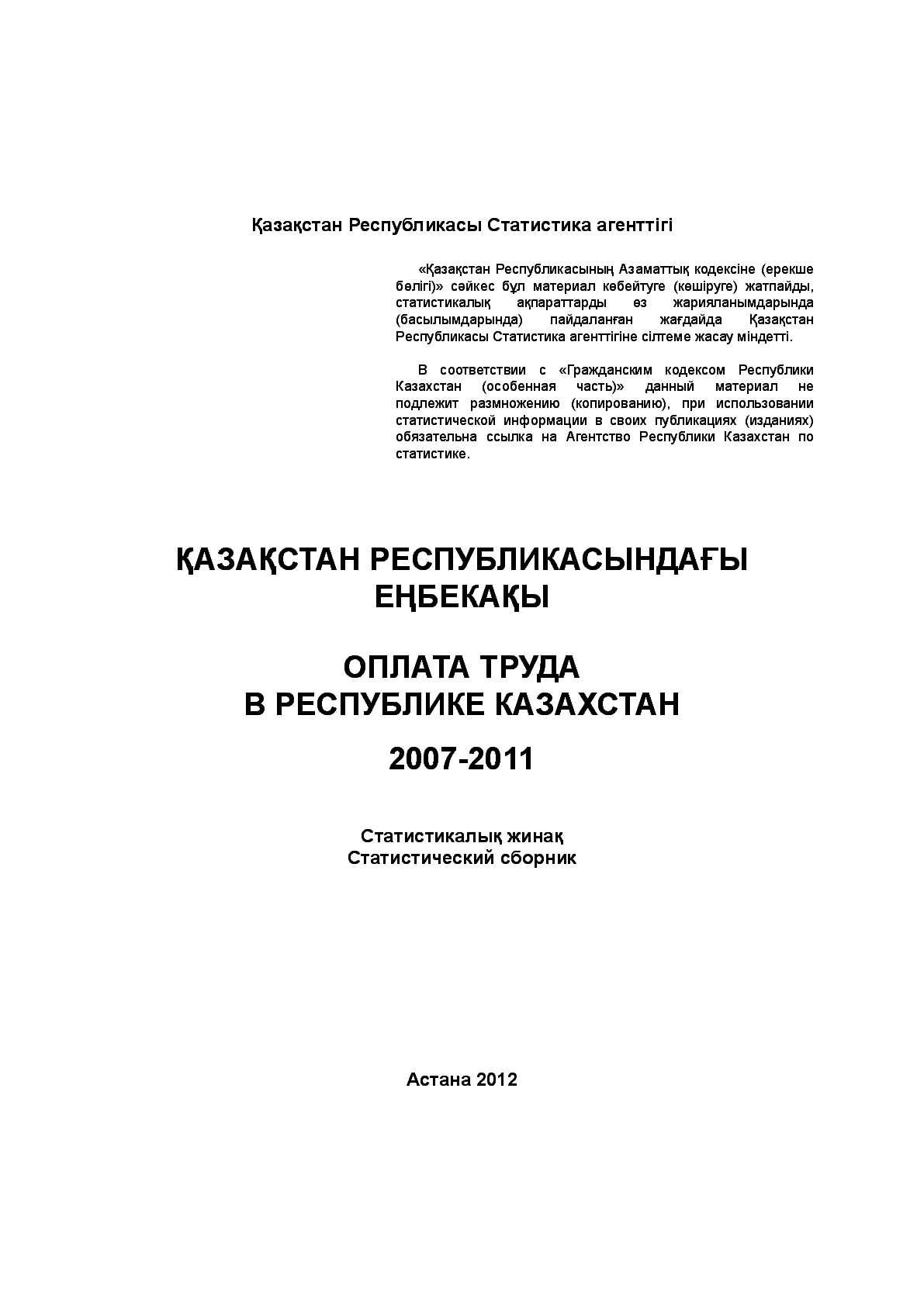 Қазақстан Республикасындағы еңбекақы = Оплата труда в Республике Казахстан [Text] : 2008-2012 : статистикалық жинақ / ; [бас ред. Ә. А. Смайылов]... – Астана : [б. ж.], 2013. - 142 б.+ 1 (CD диск) . - Мәтіні қазақ және орыс тілд. . . – 300 дана – көрсетілмеген : 30 тг.