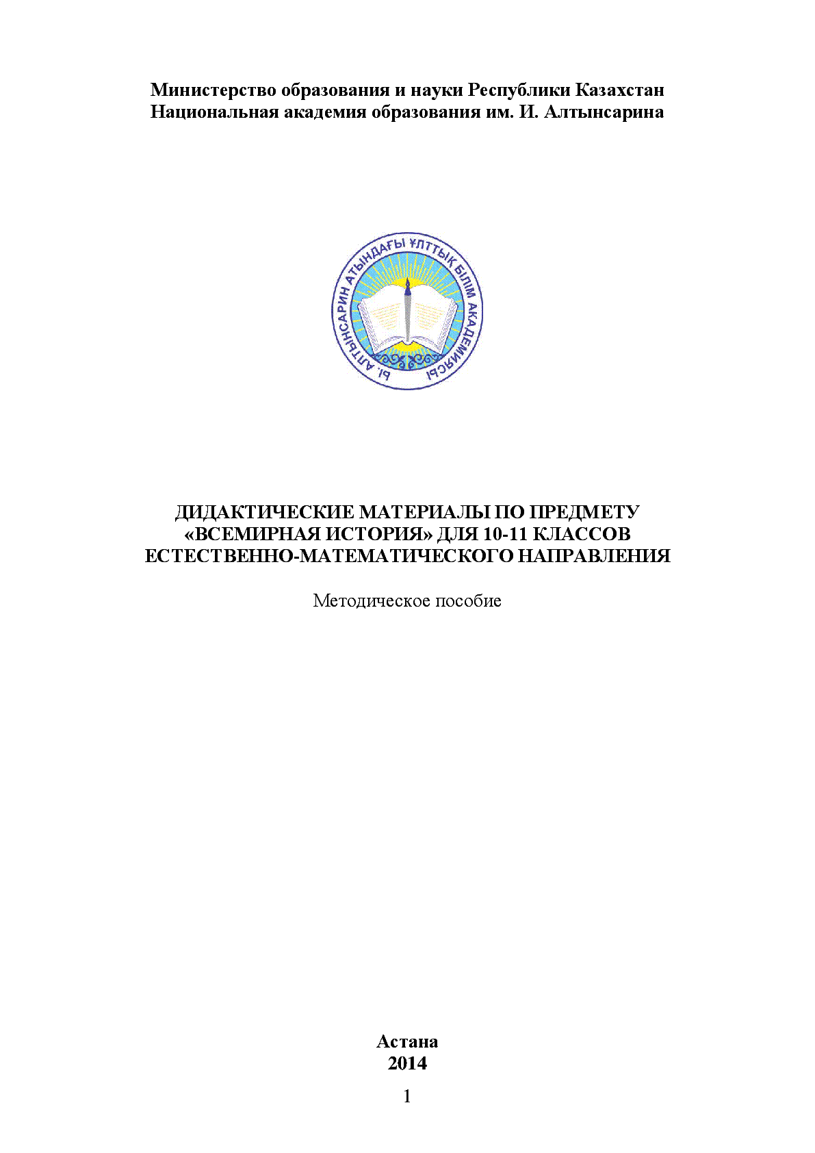 Дидактические материалы по предмету "Всемирная история" для 10-11 классов естественно-математического направления [Text], [Text] : методическое пособие / ... – Астана : [б. и.], 2014. - 51 с. . – Библиогр.: с. 49 . – [б. т.] – не указан