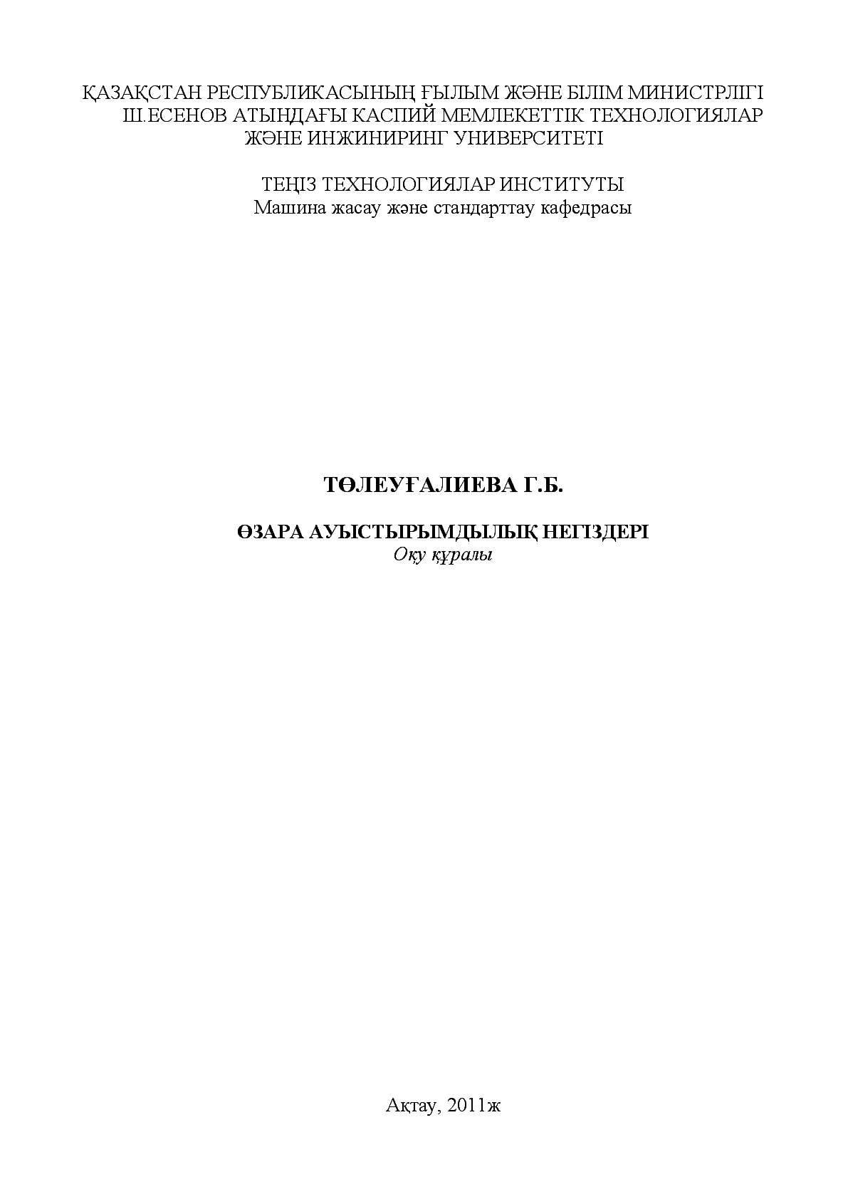 Өзара ауыстырымдылық негіздері [Мәтін] : оқу құралы / Г. Б. Төлеуғалиева ; ҚР білім және ғылым м-гі ; Ш. Есенов атынд. Каспий мем. техн. және инжиниринг ун-ті ; Теңіз техн. ин-ті ; Машина жасау және стандарттау кафедрасы... – Ақтау : [б. ж.], 2011. - 70 б., сурет.; . – Библиогр. 68 б. . – 20 дана – ISBN 978-601-7276-96-6