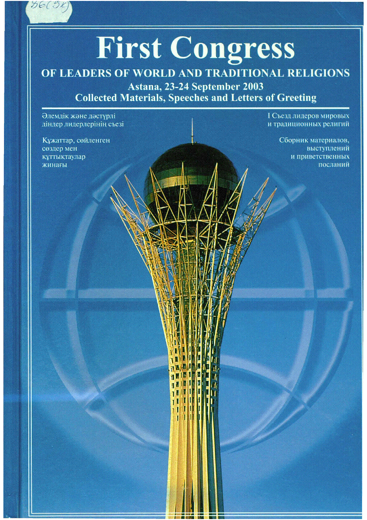 Әлемдік және дәстүрлі діндер лидерлерінің Бірінші Съезі [Мәтін] : Астана, 23-24 қыркүйек 2003 жыл : құжаттар, сөйлеген сөздер мен құттықтаулар жинағы / ... – Астана : Эдельвейс, 2003. - 256 б., сурет.; - Мәтін қазақ, орыс және ағыл. тілдерінде қатар . .