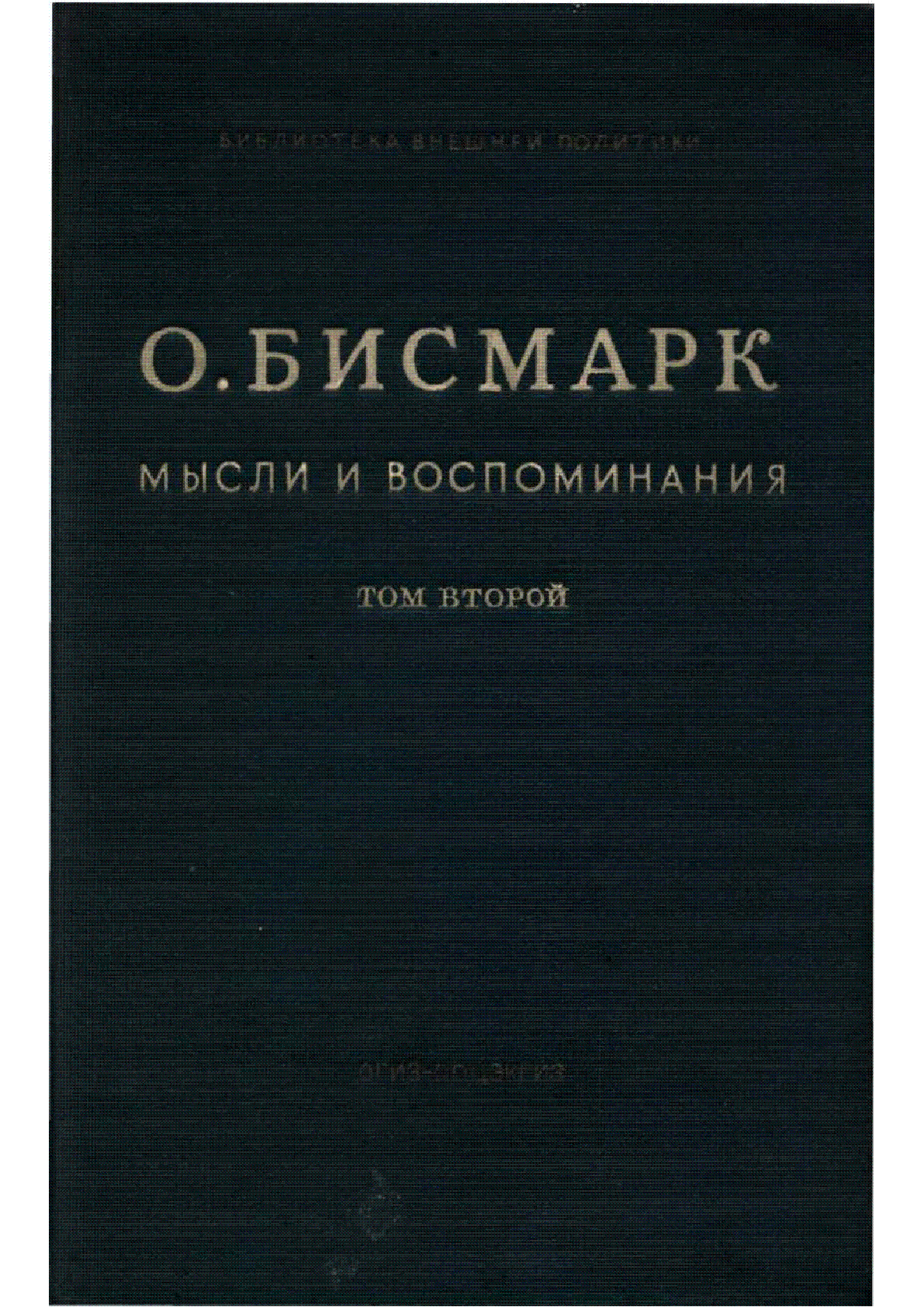 Мысли и воспоминания [Текст] / О. Бисмарк ; пер. с нем. под ред. А. С. Ерусалимского .- Москва : ОГИЗ : СОЦЭКГИЗ , 1940. – Библиотека внешней политики.– [б. т.] . (в пер.) - Құнды тарту 2015 . Т. 2 .– 288 с. (в пер.) : 100 тг.