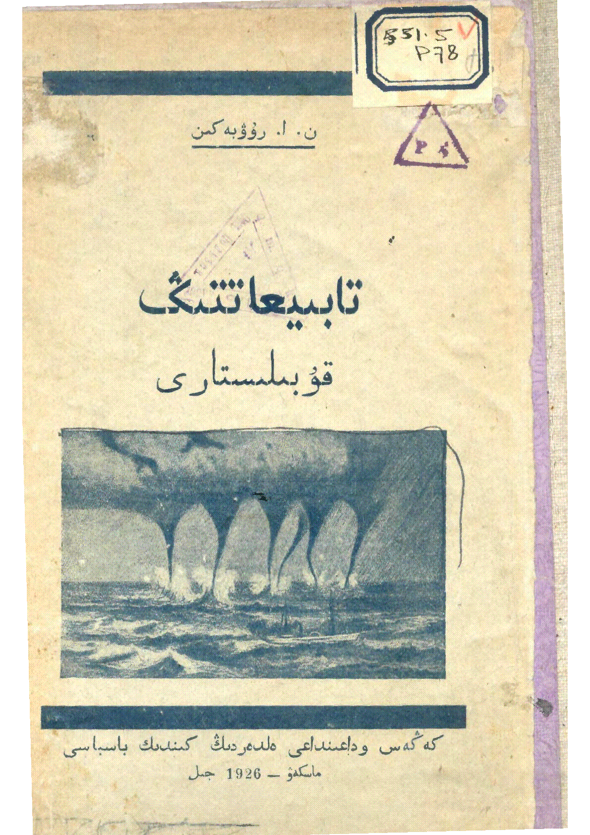 Табиғаттың құбылыстары туралы әңгіме = تابىيعاتتىڭ قۇبىلىستارى تۇۋرالى اڭگىمە [Мәтін] / Н.А. Рубакин ... – М. : Кеңестер одағындағы елдердің кіндік баспасы, 1926. - 103 б. - Араб графикасы. . . – 4 000 дана