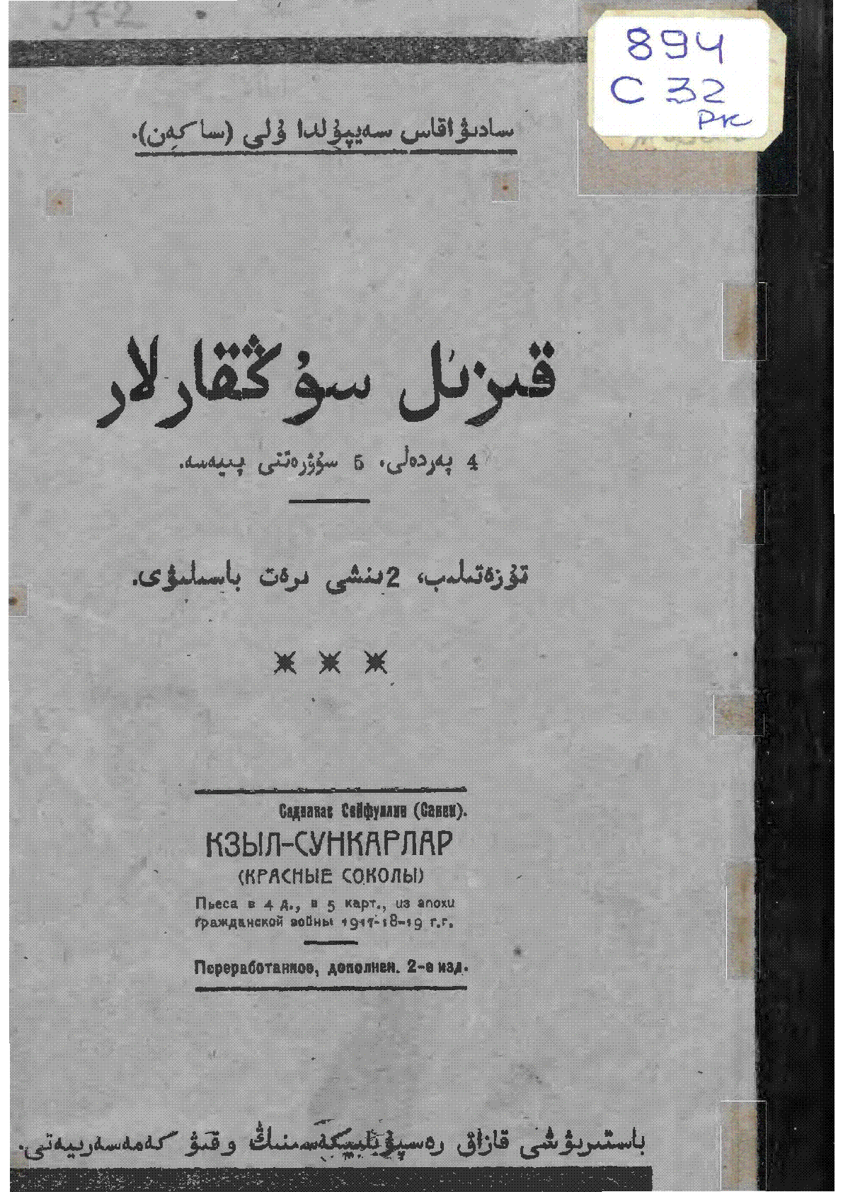 Қызыл Сұңқарлар = قىزىل سوﯖقارلار [Мәтін] : 4 перделі, 5 суретті пьесса / С. Сейфуллин ... – Семей : Семейдің губерниялық баспасы, 1926. - 52 б. - Мәтін араб графикасымен жазылған . . – 1000 дана