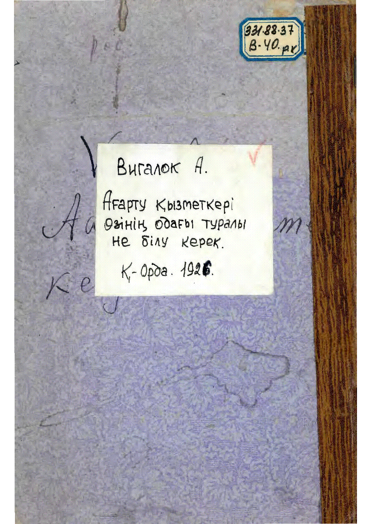 Ағарту қызметкері өзінің одағы туралы не білу керек? = اعارتىۋ قىزمەتكەرى ءوزىنىڭ وداعى تۇۋرالى نە ءبىلىۋى كەرەك [Мәтін] : 1925 жылғы 2-басылғанынан аудырылды / Вигалок ... – Қызылорда : Қазақстан мемлекет баспасы, 1927. - 76 б. - Мәтін араб графикасымен жазылған . . – 3000 дана