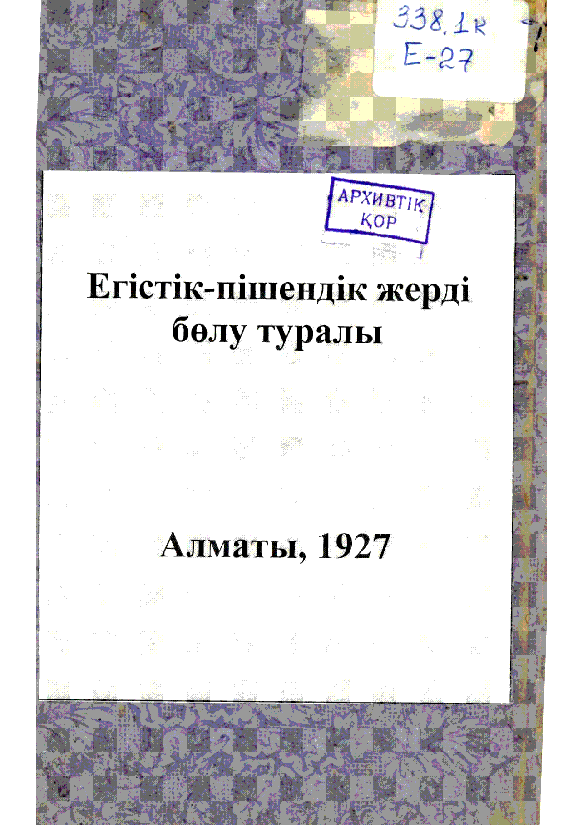 Егістік-пішендік жерді бөлу туралы = ه گىستىك - پىشه ندىك جه ردى ءبولىۋ تۇۋرالى [Мәтін] : Қазақстан үкіметінің декрет, жол, жоба нұсқаулары / ... – Алматы : Тип. ГОМХ, 1927. - 42 б. - Араб графикасы. . . – 2 500 дана