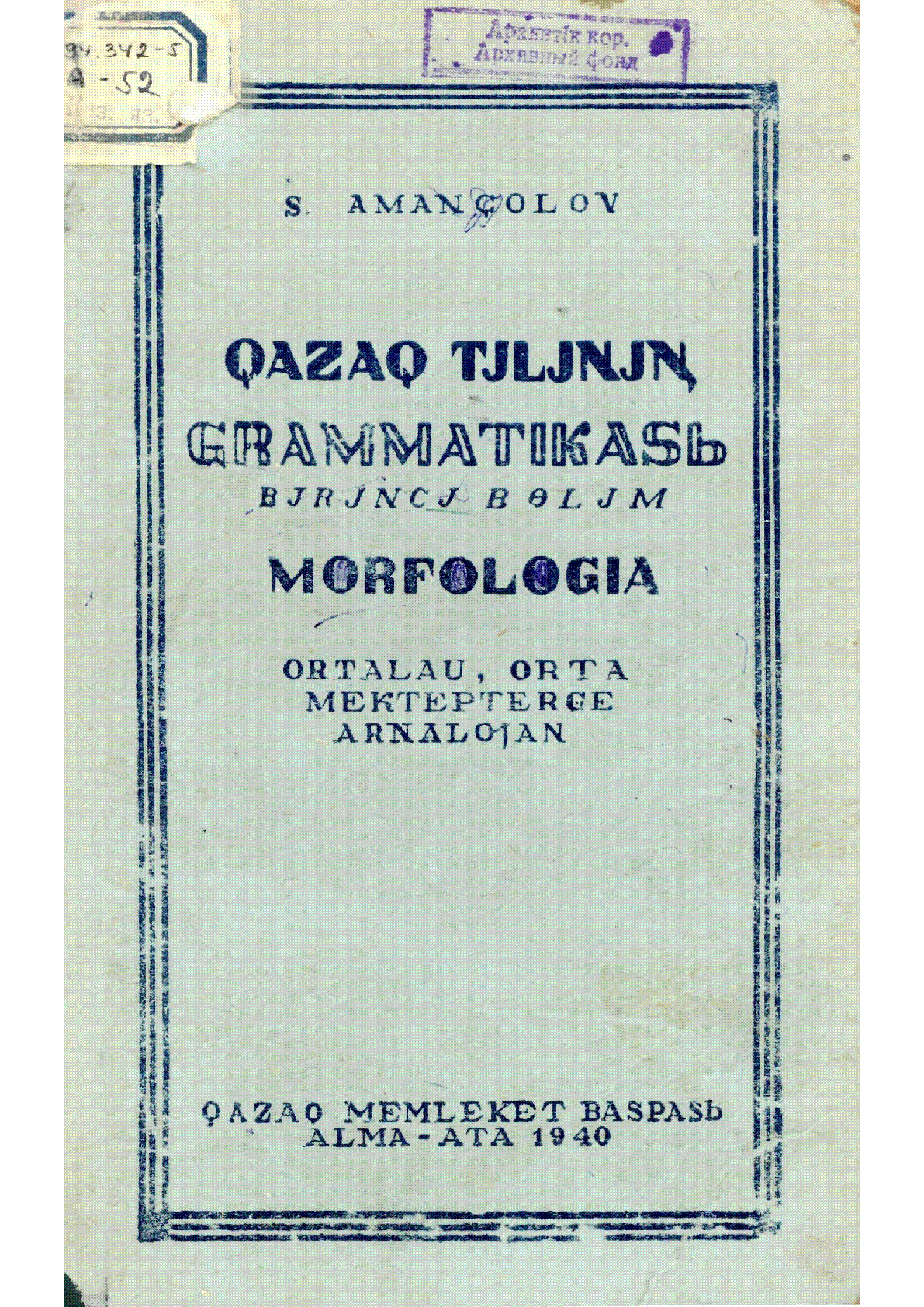 Қазақ тілінің грамматикасы [Мәтін] : орталау, орта мектептердің 5-6 кластарына арналған / С. Аманжолов ; [жауапты ред. С. Кеңесбаев] ; СССР Ғылым акад. Қазақстандық филиалы ; Қаз. ССР Оқу Халық Комиссариаты . – 3-бас. , түзет. .- Алма-Ата : Қазақ мемлекеттік баспасы , 1940.– 45 000 дана . - Мәтін латын қарпімен қазақ тілінде . 1- бөлім . Морфология– 104 бет