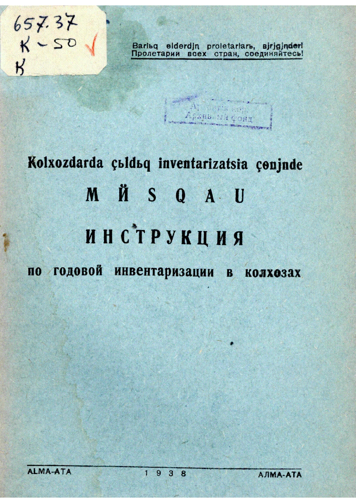 Колхоздарда жылдық инвентаризация жөнінде нұсқау = Инструкция по годовой инвентаризации в колхозах [Text] : СССР жер халық комиссариаты 1938 ж. 13 ноябрьде бекіткен / ... – Алматы : Казполиграфтрест, 1938. - 31 бет - Латын графикасымен., қазақ, орыс тіл. . . – 8 700 дана