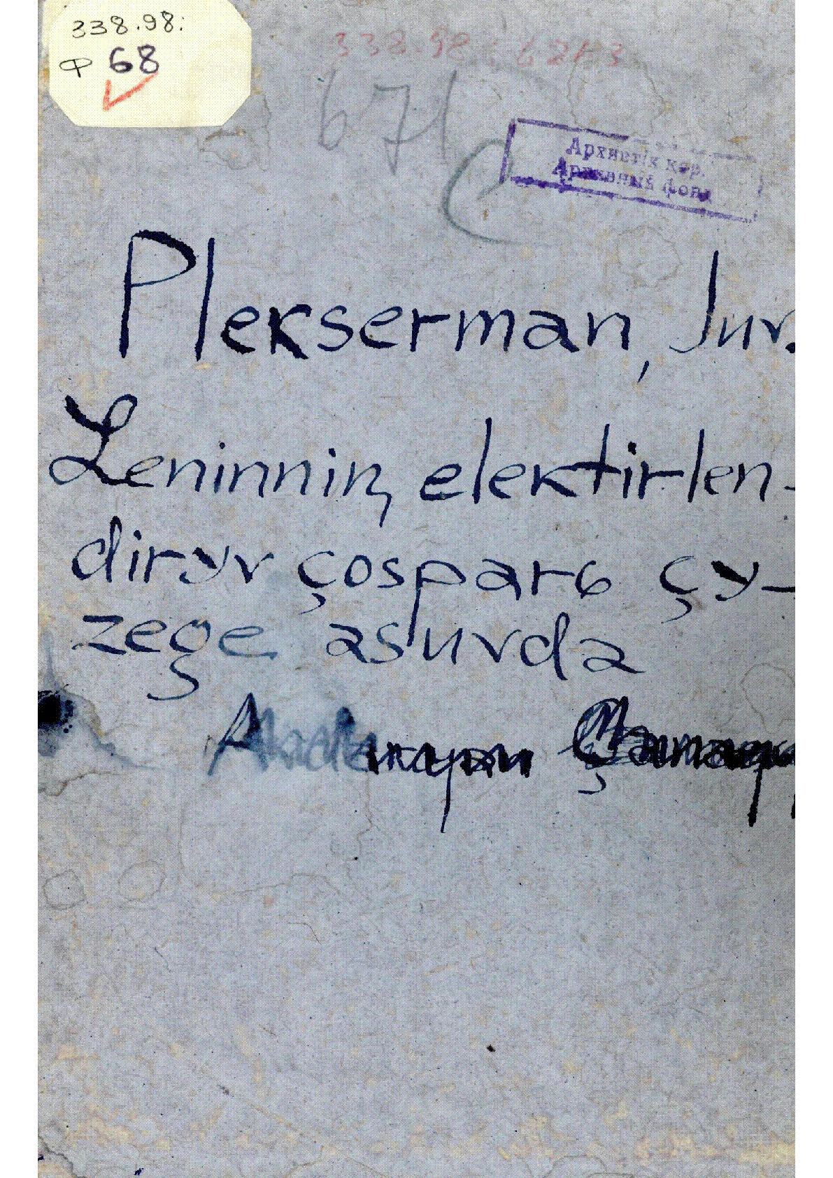 Лениннің электрлендіру жоспары жүзеге асуда [Text] / Флексерман Ю. ... – Ташкент : Өзбекстан мемлекет баспасы, 1933. - 23 бет - Латын графикасымен. . . – 2500 дана