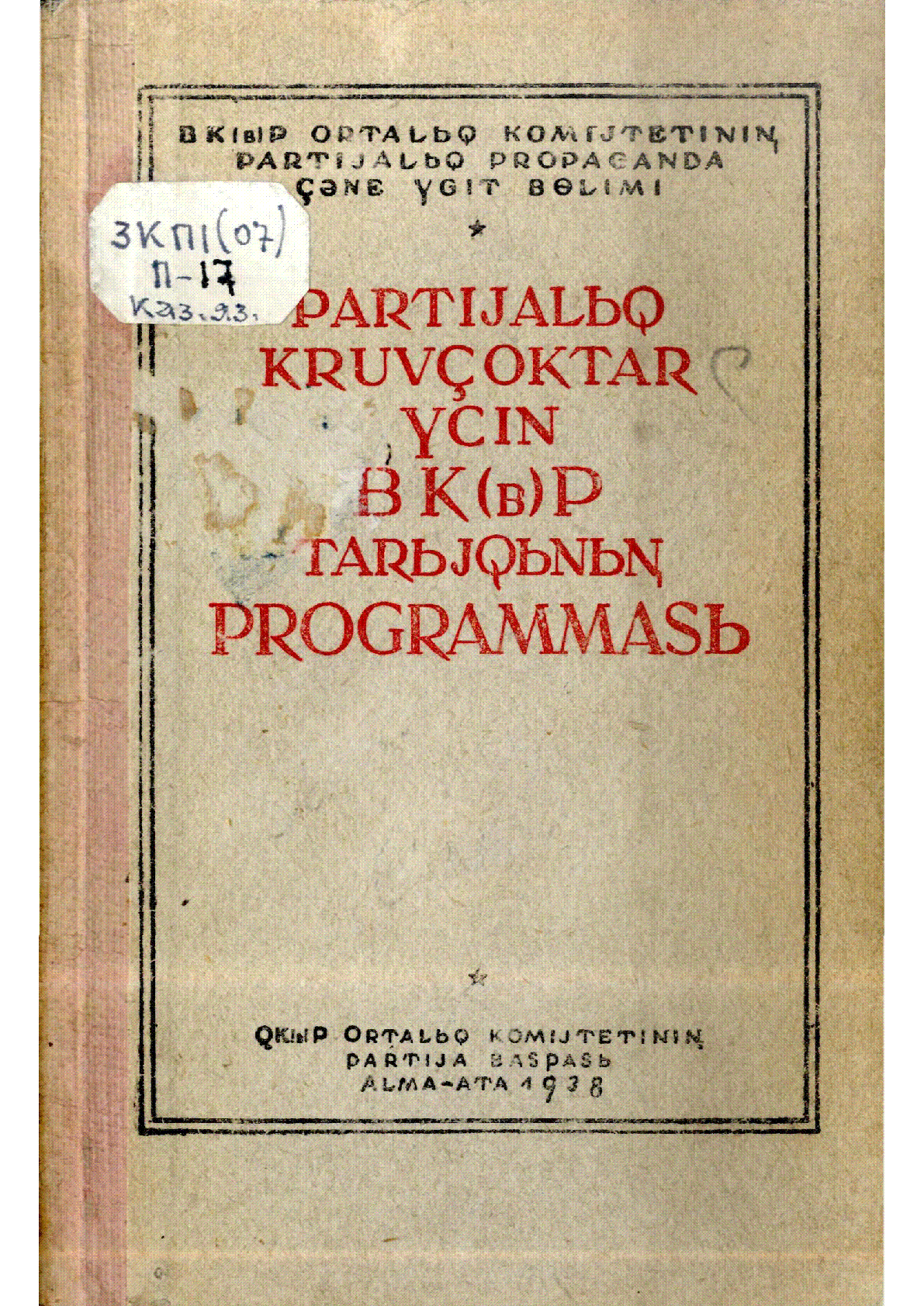 Партиялық кружоктар үшін БК(б)П тарихының программасы [Text] / ; жауапты шығ. И. Бірманов... – Алматы : Қазақстан партия баспасы, 1938. - 63 бет . . – 15160 дана