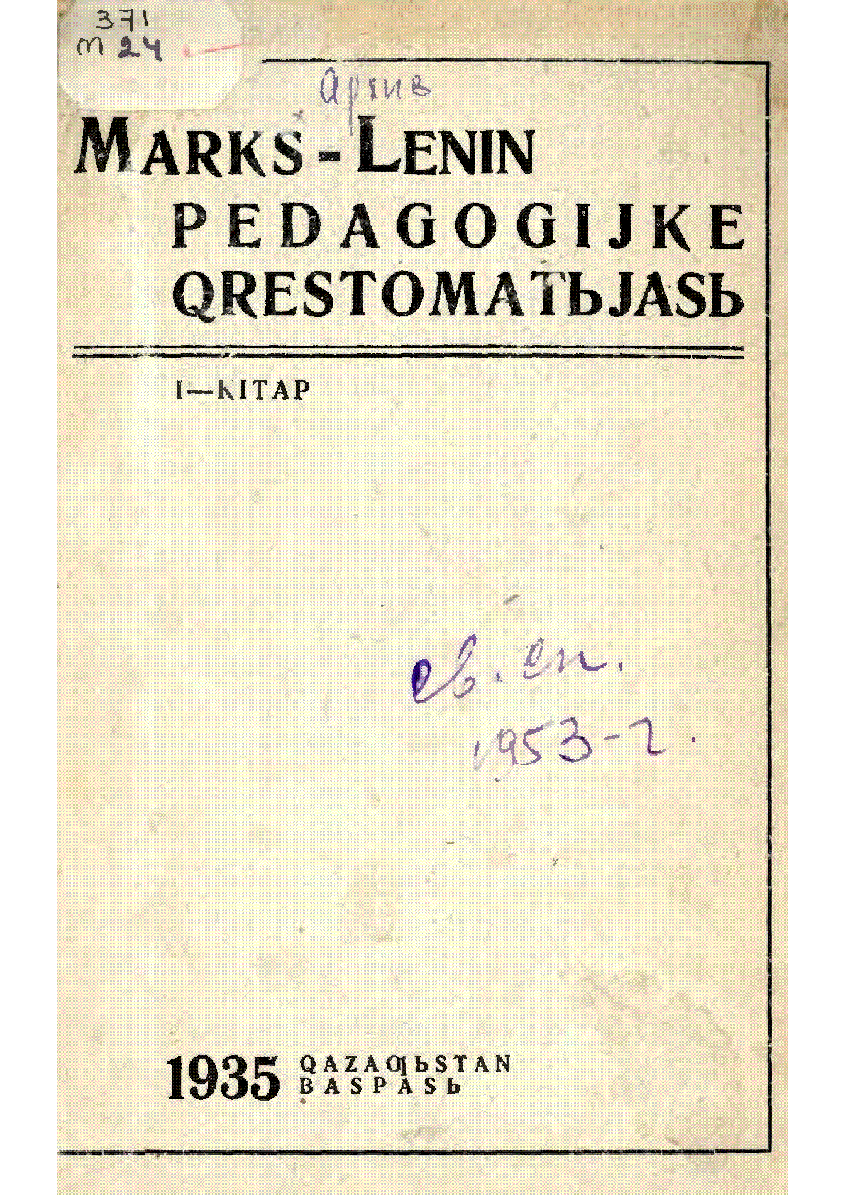 Маркс-Ленин педагогика хрестоматиясы [Text] ; құраст.: Ш. Әлжанұлы, С. Талжанұлы, Ә. Сыдықұлы, С. Қоқанбайұлы, Ә. Өтемісұлы; ред. Ш. Әлжанұлы- Қызыл-Орда : Қазақстан баспасы , 1935.– 3000 дана . - Латын графикасымен. . 2-кітап .– 148 бет