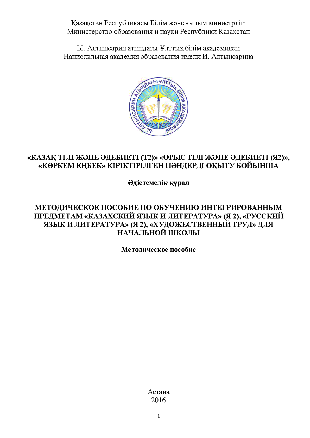 "Қазақ тілі және әдебиеті (Т2)" "Орыс тілі және әдебиеті (Я2)", "Көркем еңбек" кіріктірілген пәндерді оқыту бойынша әдістемелік құрал = Методическое пособие по обучению интегрированным предметам "Казахский язык и литература" (Я2), "Русский язык и литература" (Я2), "Художественный труд" для начальной школы [Text] / ; ҚР Білім және ғылым мин-гі ; Ы.Алтынсарин атын. Ұлттық білім акад.... – Астана : [б. ж.], 2016. - 270 б. - Мәтіні қазақ және орыс тілд. . . – [т. ж.]