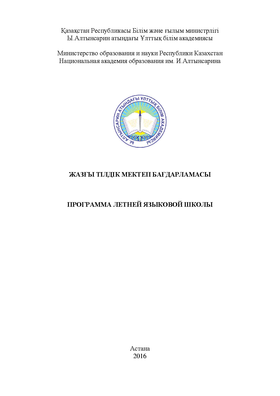 Жазғы тілдік мектеп бағдарламасы = Программа о летней языковой школе [Text] / ; ҚР Білім және ғылым мин-гі ; Ы. Алтынсарин атын. Ұлттық білім акад.... – Астана : [б. ж.], 2016. - 63 б. - Мәтіні қазақ және орыс тілд. . . – [т. ж.]