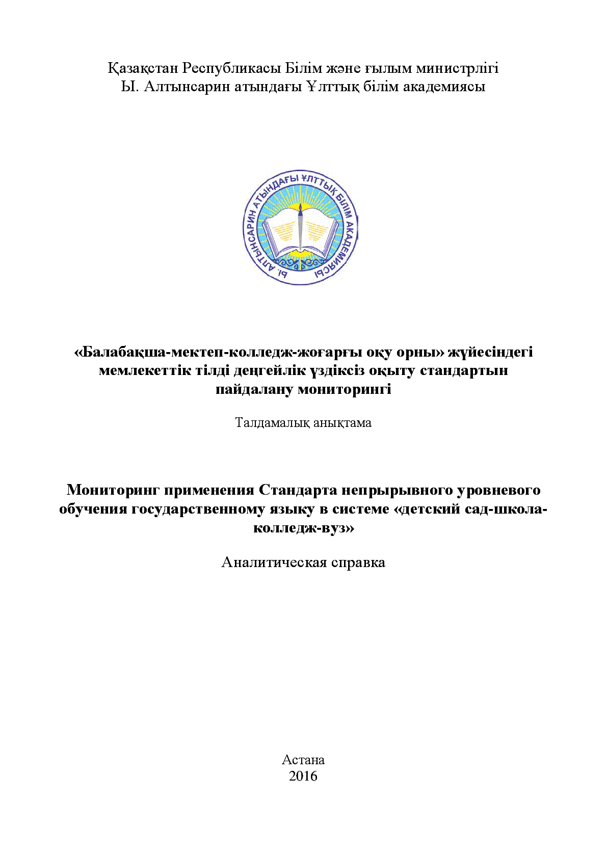 Мониторинг применения Стандарта непрырывного уровневого обучения государственному языку в системе "детский сад-школа-колледж-вуз" = "Балабақша-мектеп-колледж-жоғарғы оқу орны" жүйесіндегі мемлекеттік тілді деңгейлік үздіксіз оқыту стандартын пайдалану мониторингі [Text] / ; М-во образования и науки РК ; Национальная академия образования им. И. Алтынсарина... – Астана : [б. и.], 2016. - 85 с., ил.; . – Библиогр.: с. 84 . – [б. т.]