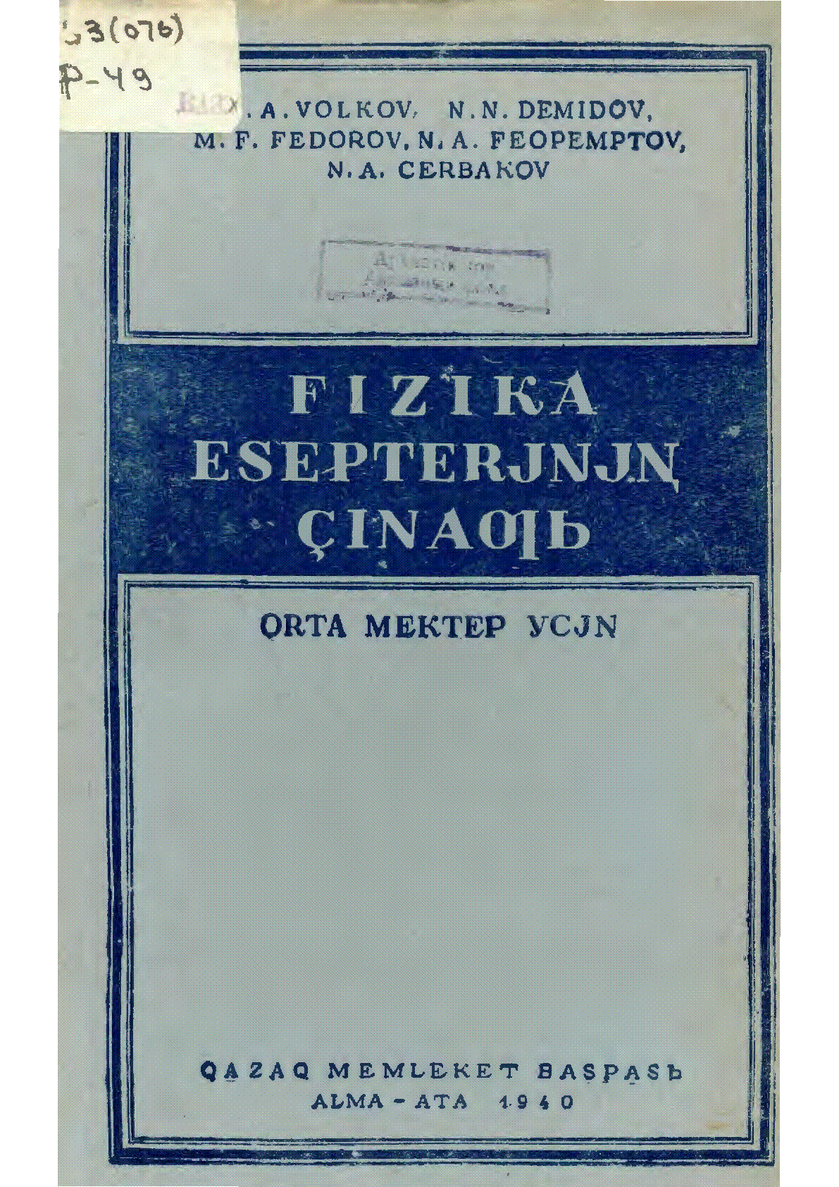 Физика есептерінің жинағы [Мәтін] : орта мектептердің 8-10-кластары үшін / К. А. Волков М. Ф. Федоров Н. А. Щербаков А. Р. Демидов Н. А. Феопемптов ; ред. басқ. Н. Н. Демидов ; [жауапты ред.: Сатпаев, Ғ. Оспанов] ; Қаз. ССР Оқу Халық Комиссариаты. – 3- бас. .. – Алма-Ата : Қазақ мемлекет баспасы, 1940. - 143, [1] б. - Мәтін латын қарпімен қазақ тілінде . . – 10000 дана (мұқ.) : 40 тг.