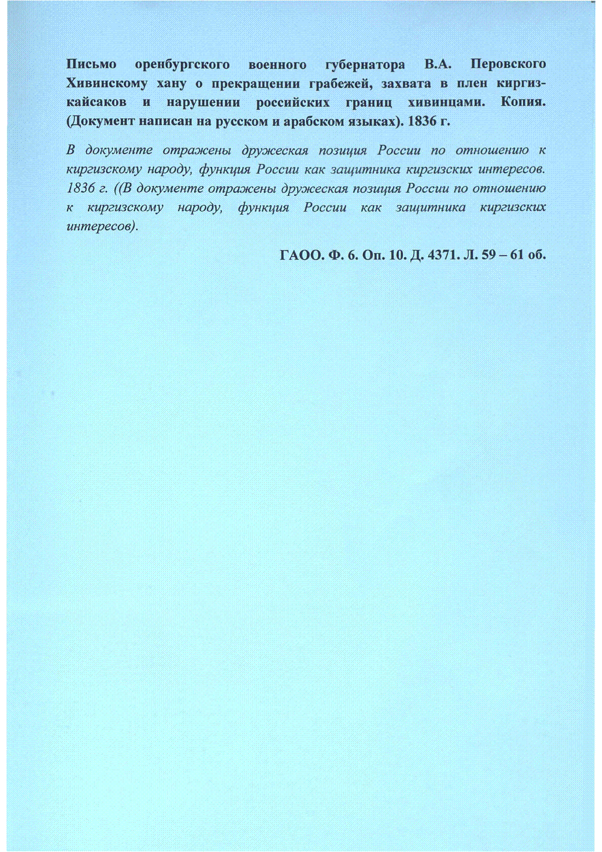Письмо Оренбургского военного губернатора В. А. Перовского Хивинскому хану о прекращении грабежей, захват в плен киргиз-кайсаков и нарушения российских границ хивинцами [Text] : копия. 1836 / В. А. Перовский ; Гос. архив Оренбург. обл... – Оренбург : [Канцелярия Оренбургского военного губернатора], 1836. - 3 л. - Текст на рус. и араб. яз. . .