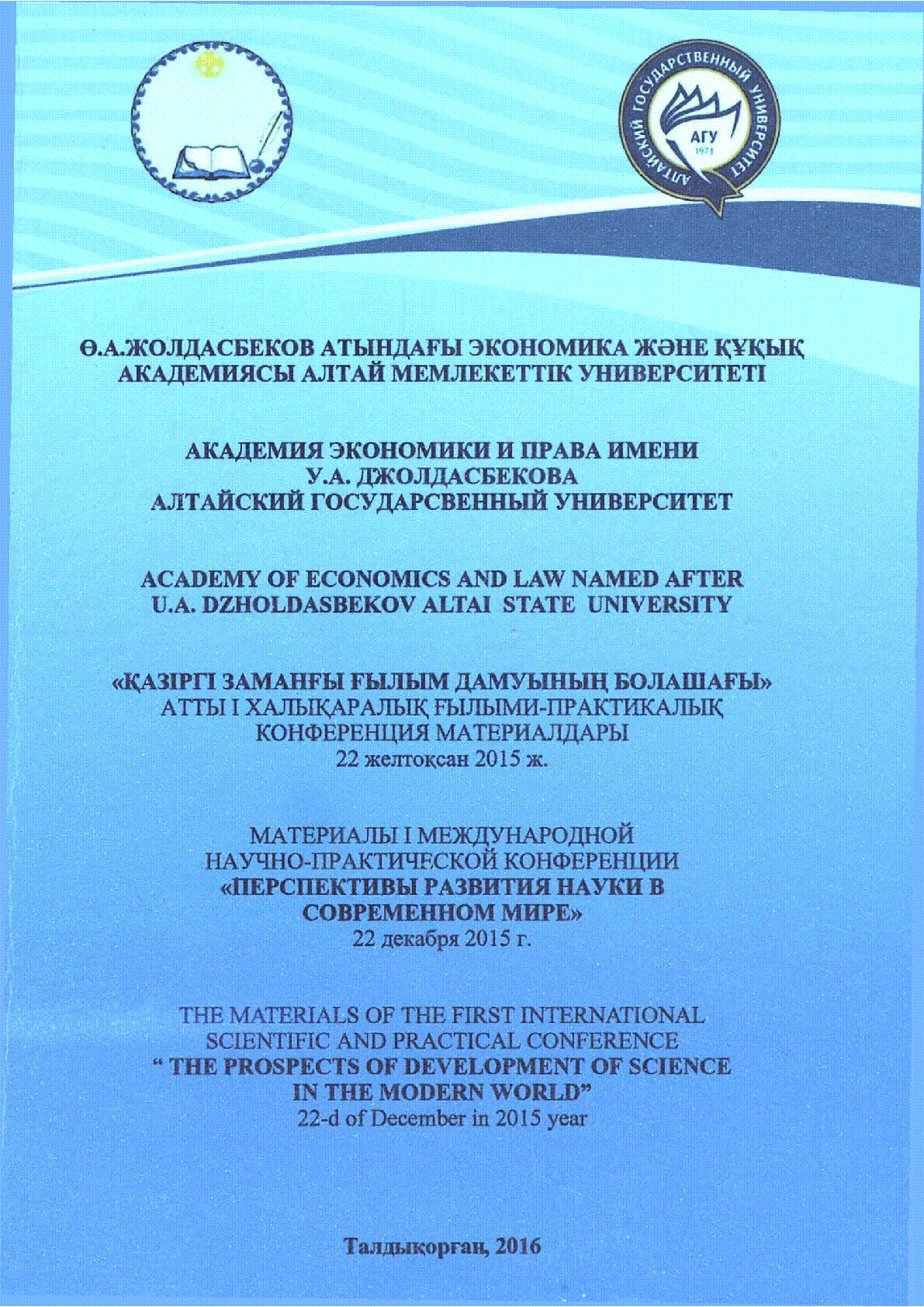 Перспективы развития науки в современном мире = Қазіргі заманғы ғылым дамуының болашағы = The Prospects of Development of Science in the Modern World [Текст] : материалы I международной научно-практической конференции : 22 дек. 2015 г. : [сборник материалов] / ; отв. ред. С. А. Алжанкулова ; Академия экономики и права им. У. А. Джолдасбекова ; Алтайский государственный ун-т... – Талдыкорган : [б. и.], 2016. - 745, [1] с. . – Библиогр. в конце ст. . – 115 экз. – 978-601-7443-96-2
