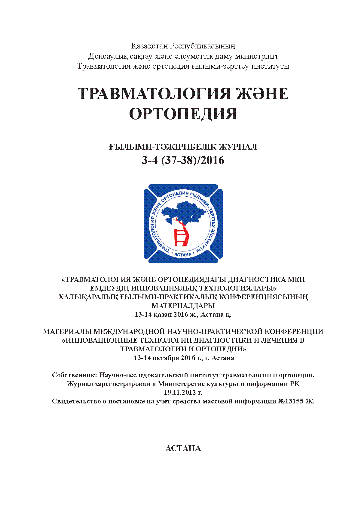 Травматология және ортопедия. - Астана, 2016. - № 3-4 (37-38). - 243с. [Текст] : ғылыми-тәжірибелік журнал=научно-практический журнал / ISSN<br>