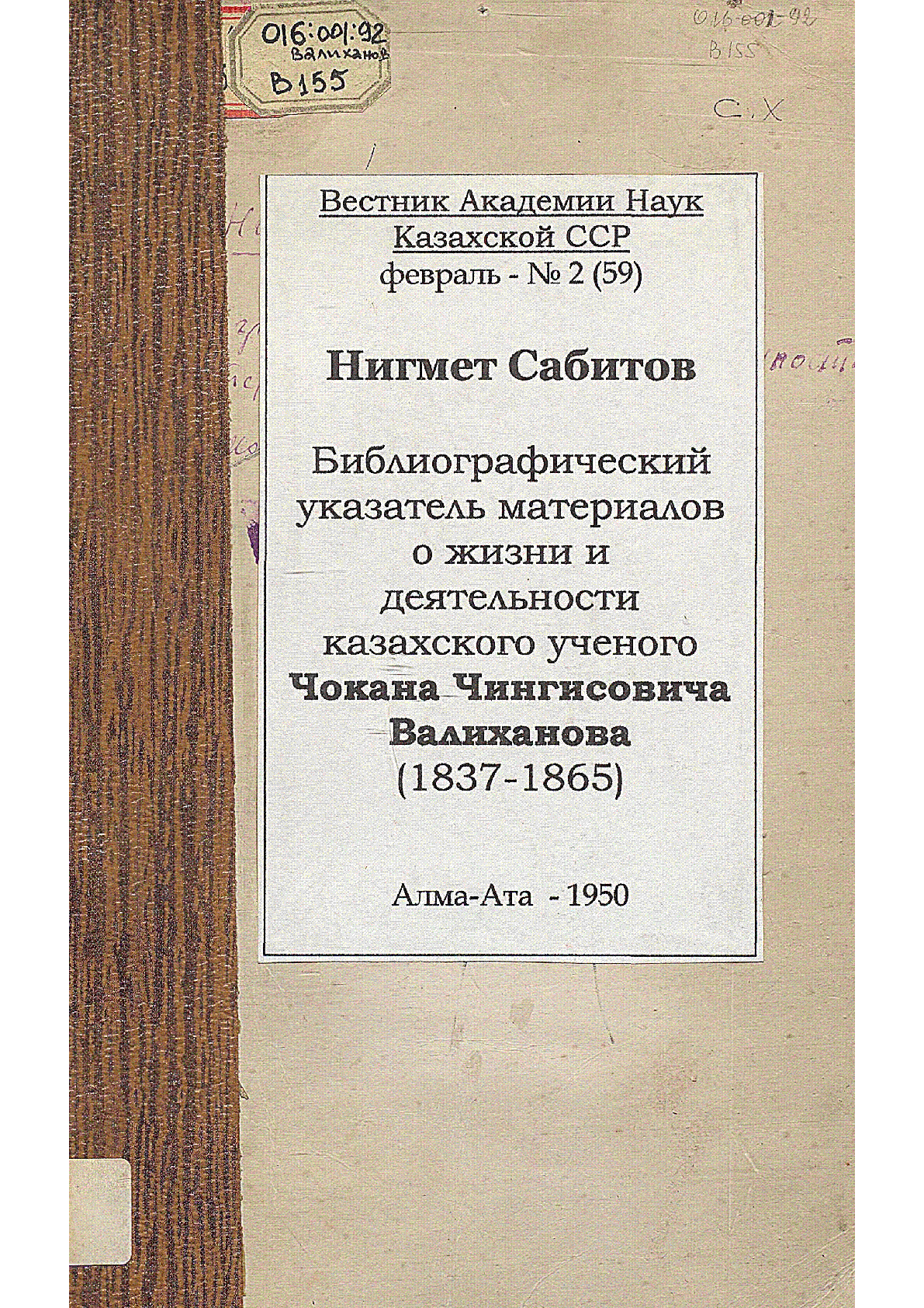 Библиографический указатель материалов о жизни и деятельности казахского ученого Чокана Чингисовича Валиханова [Текст] : (1837-1865) / Сабитов Нигмет ... – Алма-Ата, 1950. - С. 118-121 . .