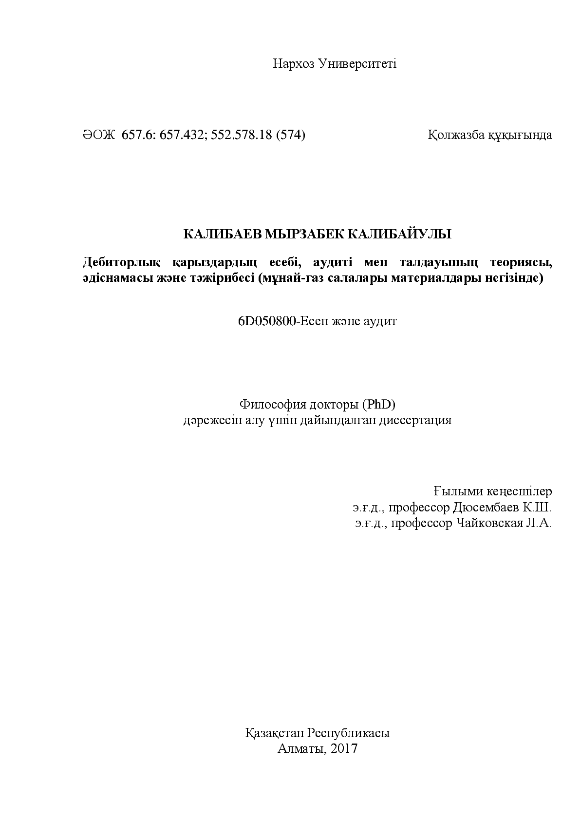 Дебиторлық қарыздардың есебі, аудиті мен талдауының теориясы, әдіснамасы және тәжірибесі (мұнай-газ салалары материалдары негізінде) [Электрондық ресурстар] : философия докторы (PhD) дәрежесін алу үшін дайындалған диссертация: 6D050800 - Есеп және аудит / М. К. Калибаев ; ғылыми кеңесшілер: К. Ш. Дюсембаев, Л. А. Чайковская ; Нархоз Университеті... – Алматы : [б. ж.], 2017. - Электрон. мәлімет, 1 электрон. опт. диск (CD-ROM); контейнерде, 12х14 см . – Библиогр.: 152-160 б. . – [т. ж.] : 100 тг.