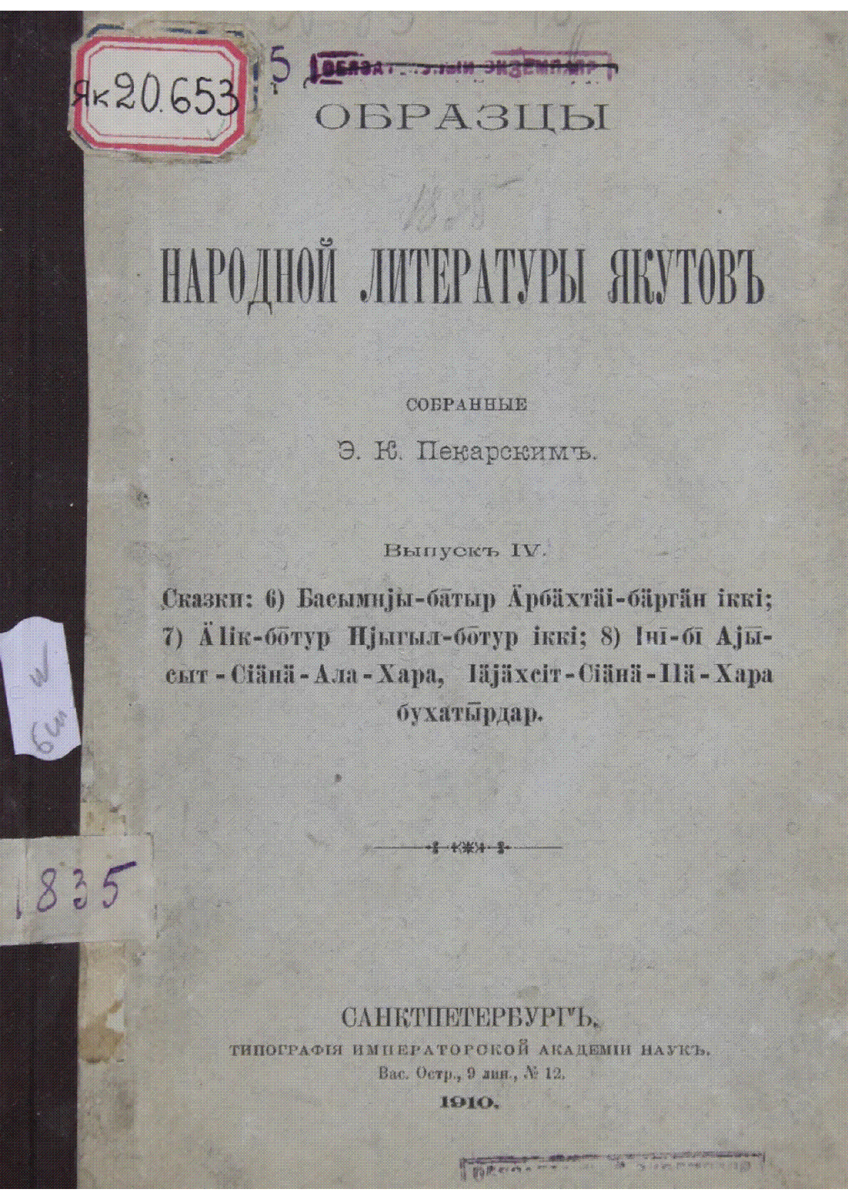 Образцы народной литературы якутов [Text] ; собранные Э. К. Пекарским .- Санкт-Петербург : Типография Императорской Академии наук , 1910.– [б. т.] . - Текст на якутском языке . вып. 4 . Сказки– 340 с.