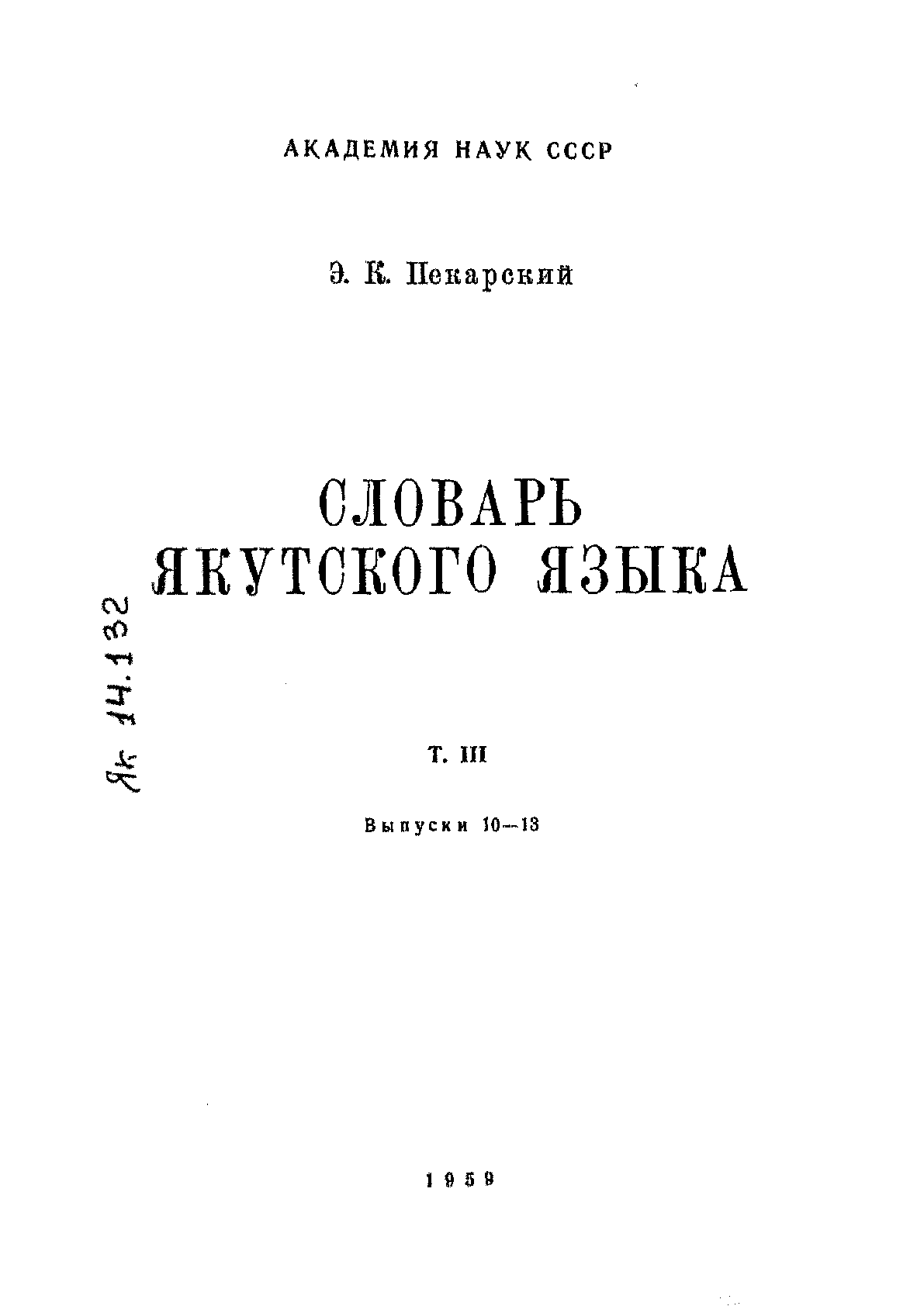 Словарь якутского языка [Текст] / Э. К. Пекарский ; Акад. наук СССР . – [2-е изд.] ,- [Москва] : [б. и.] , 1959.– [б. т.] . (в пер.) - Отпечатано фотомех. способом с 1-го изд. (Пекарский Э. К. Словарь якутского языка. Вып. 10 (та-туор) . - Ленинград, 1927). - Шора Сарыбаев қоры . Библиогр.: с. I-VIII Т. 3, вып. 10-13 .– с. 2509-3858 (в пер.) : 0 тг.