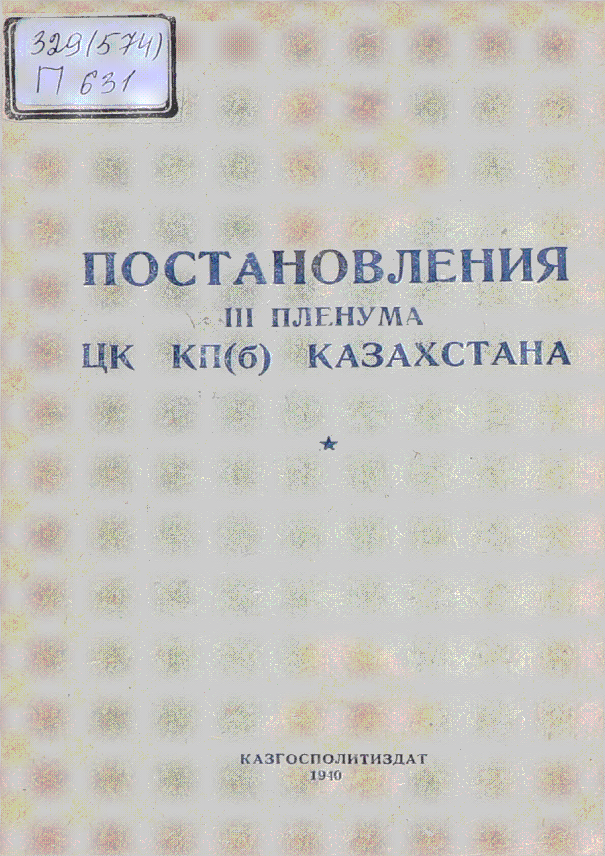 Постановления III Пленума ЦК КП(б) Казахстана [Текст] / ... – Алма-Ата : Казгосполитиздат, 1940. - 22, [1] с. . . – 20000 экз. : 20 тг.