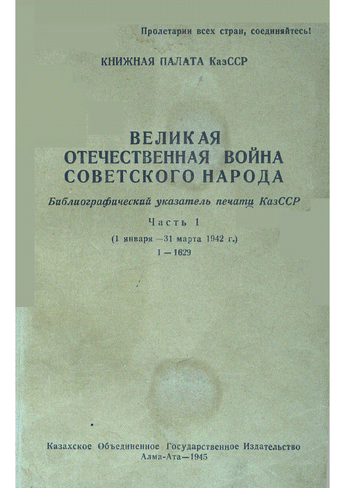 Великая Отечественная война советского народа [Текст] : библиогр. указ. печати КазССР ; Кн. палата КазССР .- Алматы : Каз. объединен. гос. изд-во , 1945.– 500 экз. . Ч. 1 . (1 января - 31 марта 1942 г.) 1-1629– 114, [2] с. : 20 тг.