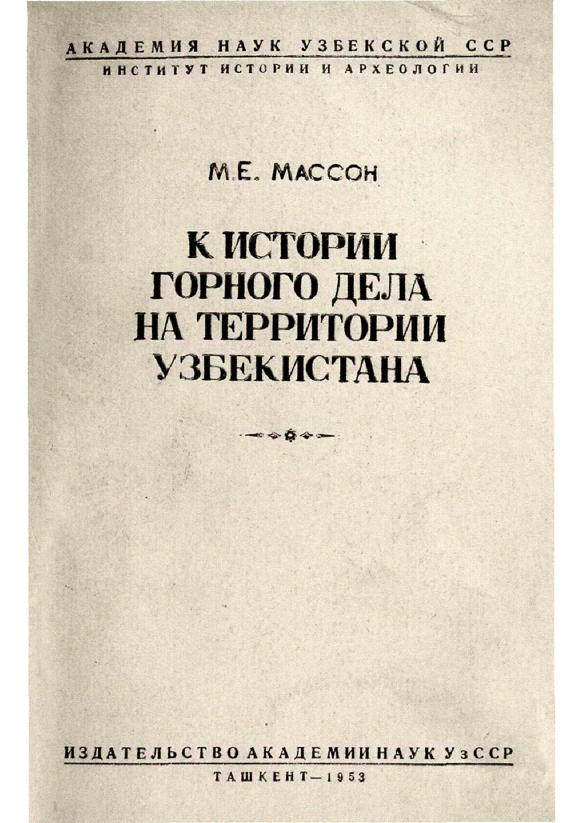 К истории горного дела на территории Узбекистана [Text] / М. Е. Массон ; Акад. наук Узбекской ССР ; Ин-т истории и археологии... – Ташкент : Издательство Академии наук УзССР, 1953. - 73, [2] с. . . – 1000 экз.