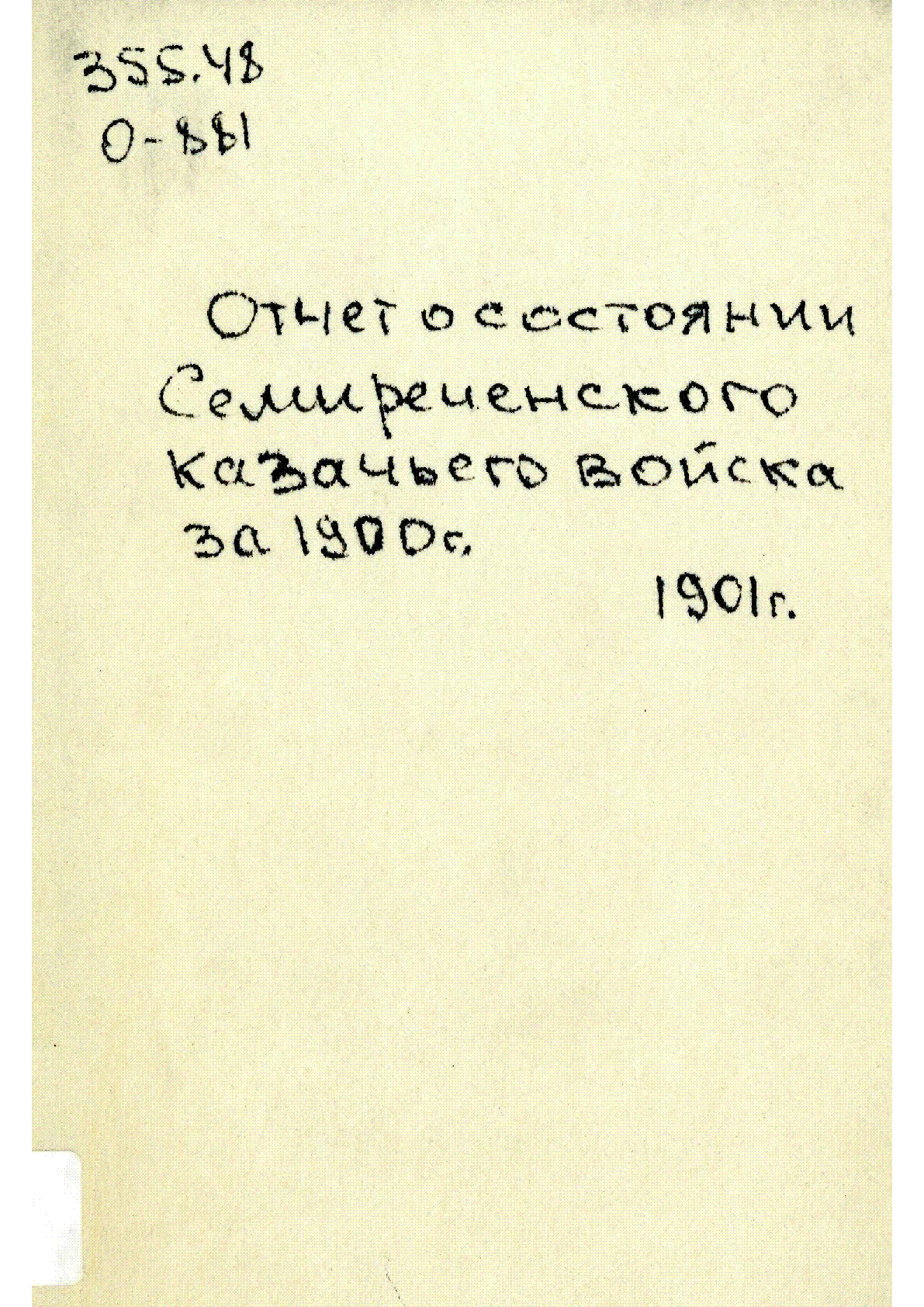 Отчет о состоянии Семиреченского казачьего войска за 1900 год [Текст] / ... – Верный : Тип.Войск.Прав.Семиреченского каз.войска, 1901. - 57 с. . . – б.т.