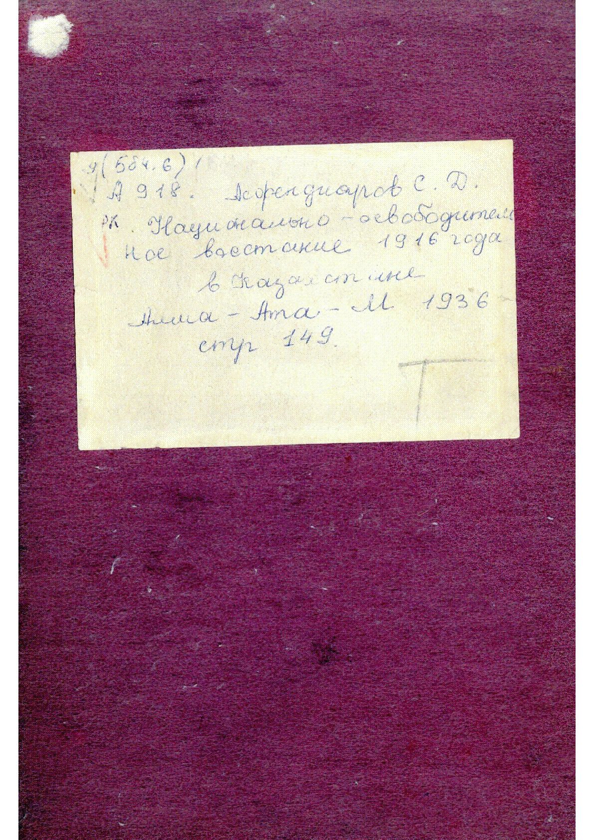 Национально-освободительное восстание 1916 года в Казахстане [Текст] / Асфендиаров С.Д. ; АН СССР... – Алма-Ата ; Москва : Казакстанское краевое изд-во, 1936. - 150 с. 23х15,5 см. . . – 10000 экз.