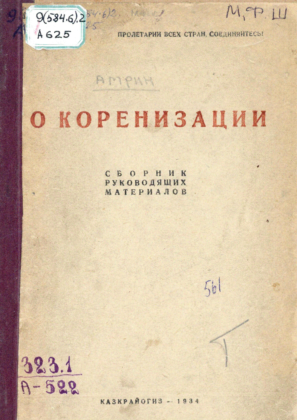 О коренизации = Ленинизм мәселелері [Текст] : сборник руководящих материалов / ; сост.: Х. Ш. Амрин, Е. И. Князева. – изд. первое .. – Алма-Ата ; Москва : Казкрайогиз, 1934. - 55, [1] c. - Тұрсынбек Кәкішұлы қоры . . – 3500 экз. : 10 тг.