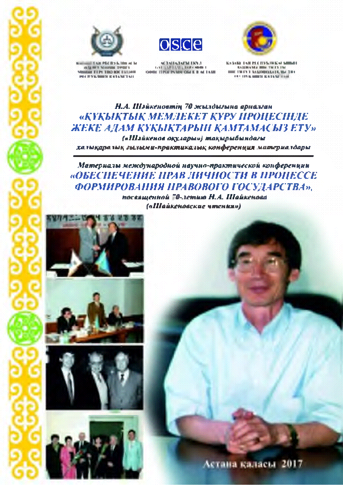 "Құқықтық мемлекет құру процесінде жеке адам құқықтарын қамтамасыз ету" = Материалы международной научно-практической конференции "Обеспечение прав личности в процессе формирования правового государства" посвященной 70-летию Н. А. Шайкенова ("Шайкеновские чтения") [Мәтін] : Н. А. Шәйкеновтің 70 жылдығына арналған ("Шәйкенов оқулары") тақырыбындағы халықаралық ғылыми-практикалық конференция материалдары / ; Қазақстан Республикасы Әділет министрлігі ; Астанадағы ЕҚЫҰ бағдарламалар офисі ; Қазақстан Республикасы Заңнама институты ; [редакциялық алқа: З. Х. Баймолдина [ж. б.]]... – Астана : Қазақстан Республикасының Заңнама институты, 2017. - 243 б. . – Библиография мақала соңында . – 80 дана – ISBN 978-601-7366-27-8 : 60 тг.