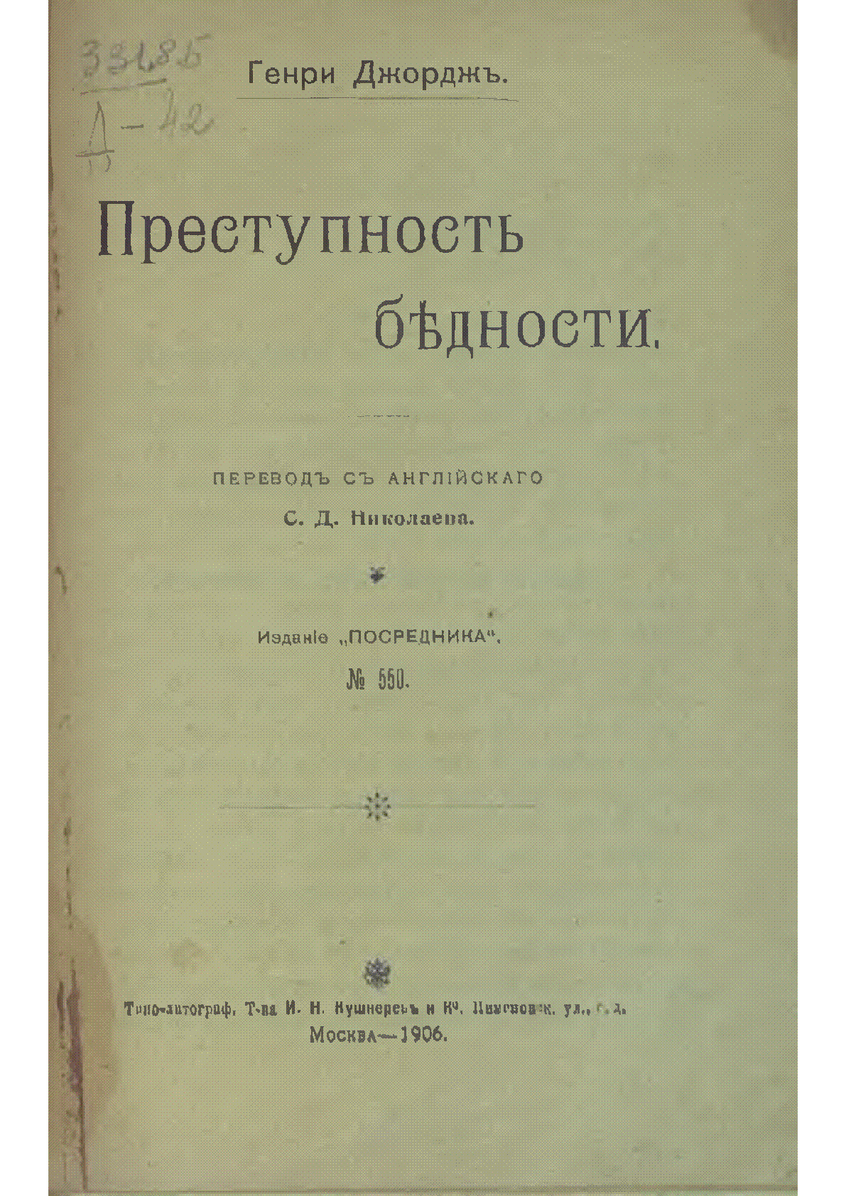 Преступность бедности [Текст] / Г. Джордж ; [пер. с англ. С. Д. Николаева]... – Москва : Посредник, 1906. - 48 с. . . – [б. т.]