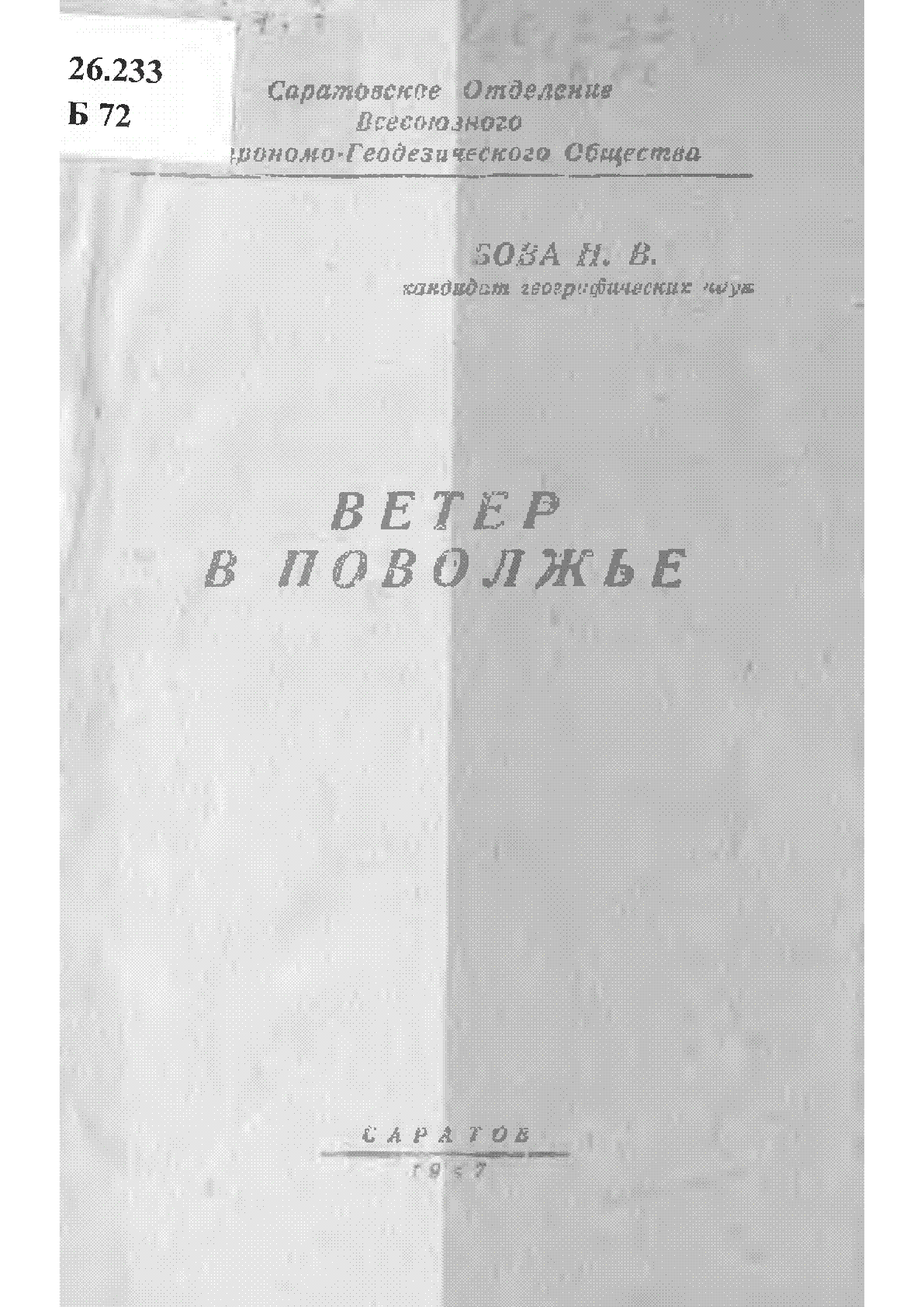 Ветер в Поволжье [Текст] / Н. В. Бова ; Саратов. отд-ние всесоюз. астрономо-геодезическое о-ва... – Саратов : [б. и.], 1947. - 114, [2] с., табл.; . – Библиогр.: с. 114-115 . – 3000 экз.