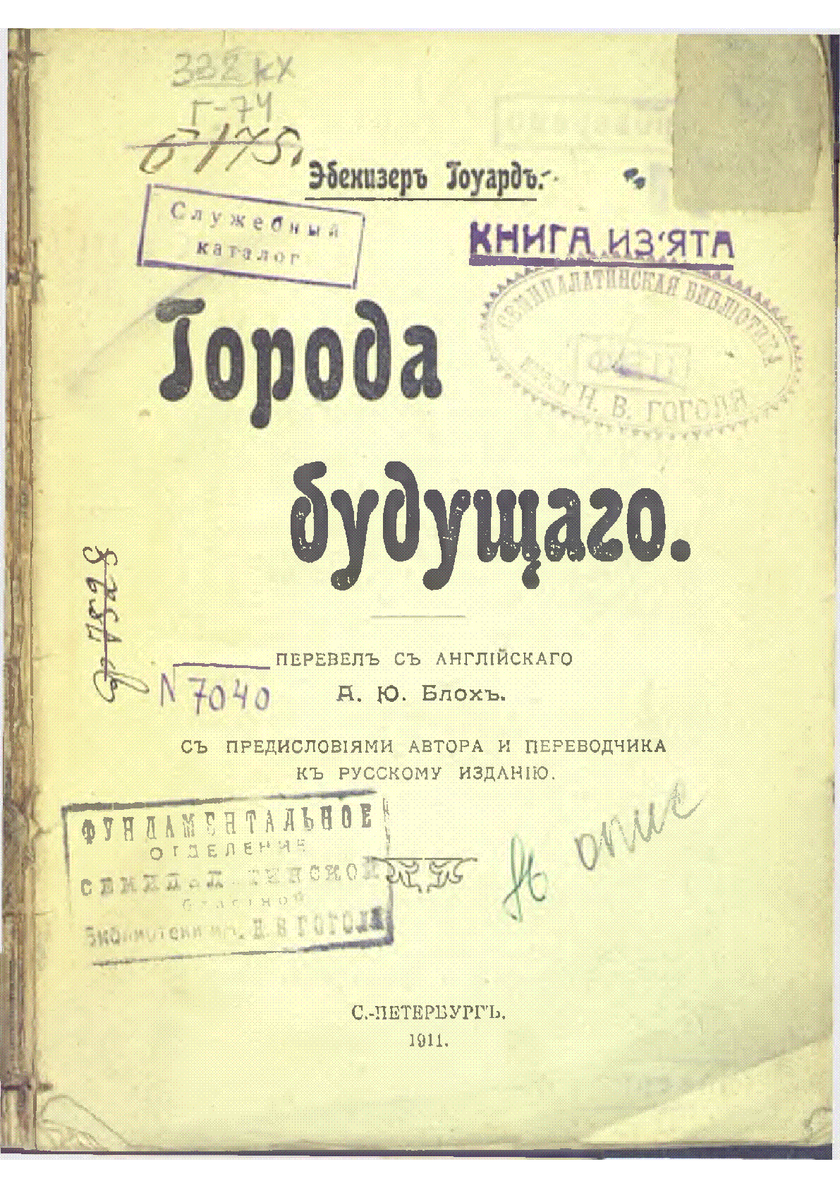 Города будущего [Текст] / Э. Говард ; пер. с англ. А. Ю. Блох ; С предисл. авт. и пер. к рус. изд.... – Санкт-Петербург : Общественная польза, 1911. - 177 с. - Текст на старорусс. яз. - Автор на тит. л.: Эбенизерь Гоуардь . . – [б. т.]