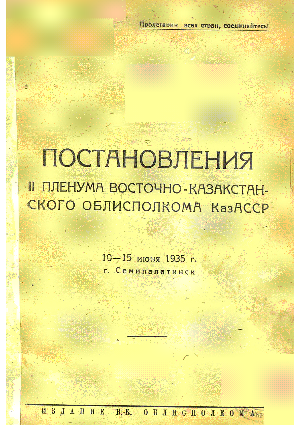 Постановление ІІ Пленума Восточно-Казахстанского облисполкома КазАССР [Текст] : 10-15 июня 1935 г. / ; [отв.: Нурмухамедов, Аймагамбетов]... – Семипалатинск : [б. и.], 1935. - 40 c. . . – [б. т.]