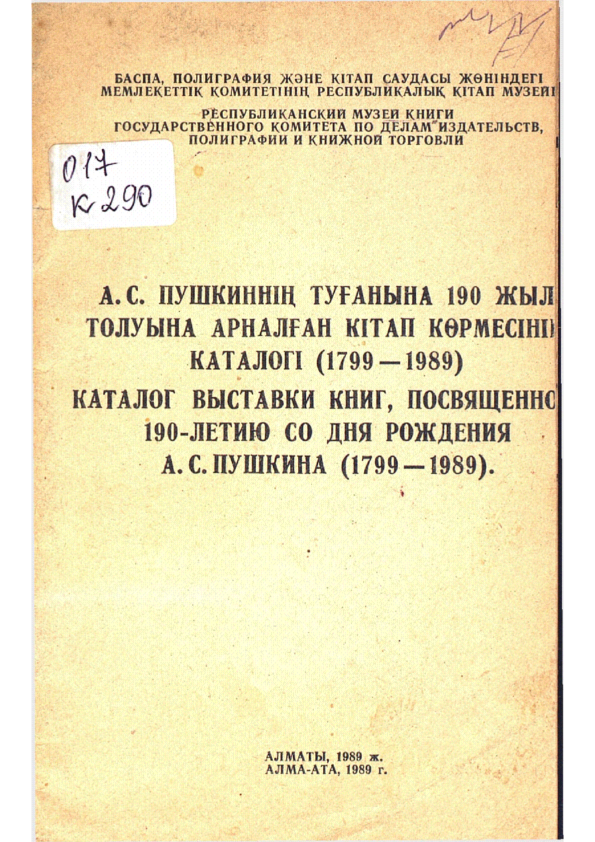Каталог выставки книг, посвященной 190-летию со дня рождения А. С. Пушкина (1799-1989 гг.) = А. С. Пушкиннің туғанына 190 жыл толуына арналған кітап көрмесінің каталогі (1799-1989) [Текст] / ; сост. А. Бондаренко ; РМК ГКДИПКТ... – Алматы : [б. и.], 1989. - 24 с. . . – 1000 экз. : 20 тг.