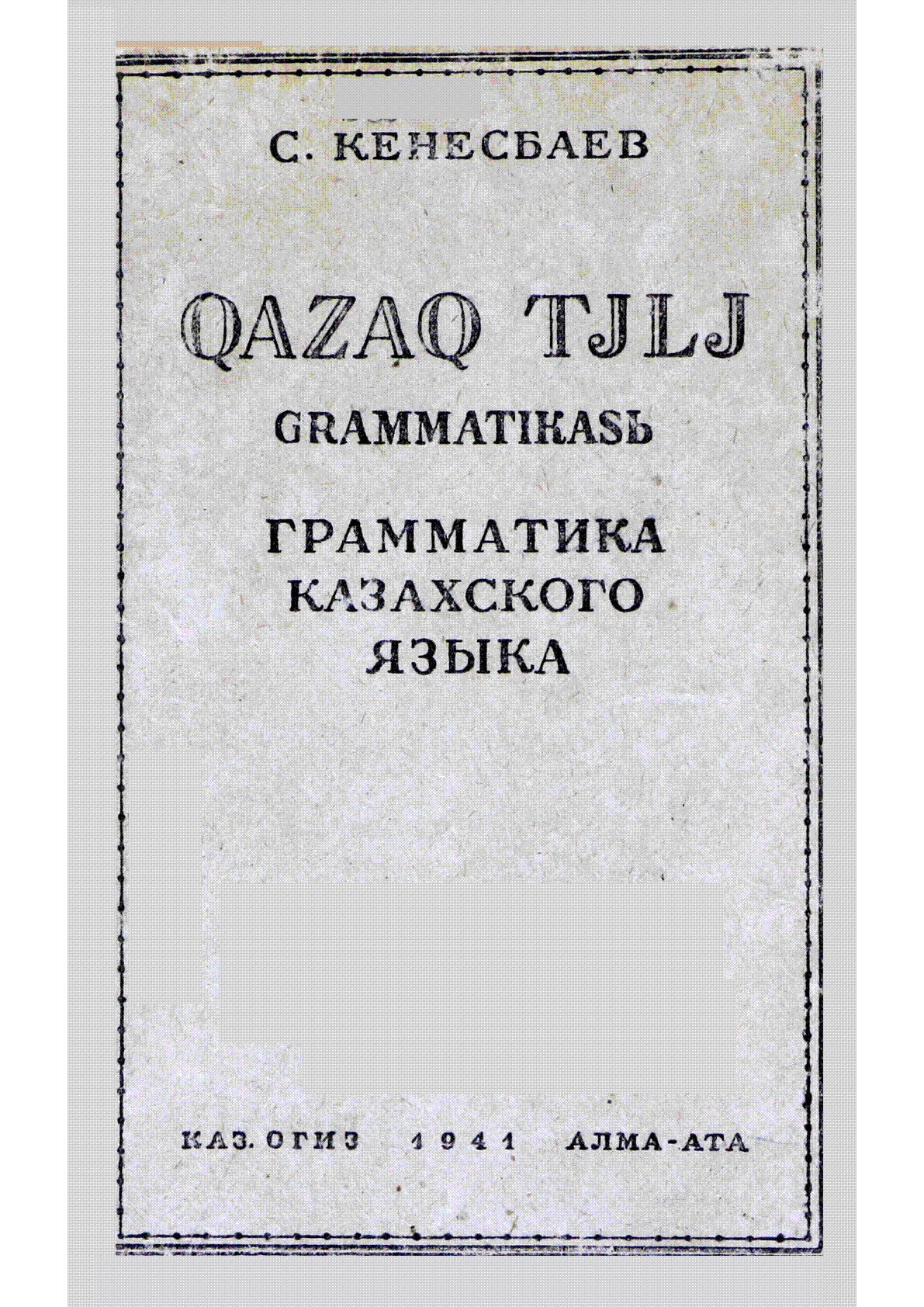 Қазақ тілі грамматикасы = Грамматика казахского языка для русской школы [Мәтін] : морфология : орыс орта мектептерінің 8-10 кластарына арналған / С. Кенесбаев . – 2-изд. ., испр.. – Алма-Ата : Каз. ОГИЗ, 1941. - 148, [1] б. - Мәтін латын қарпімен қазақ тілінде . . – 50000 дана (мұқ.) : 20 тг.