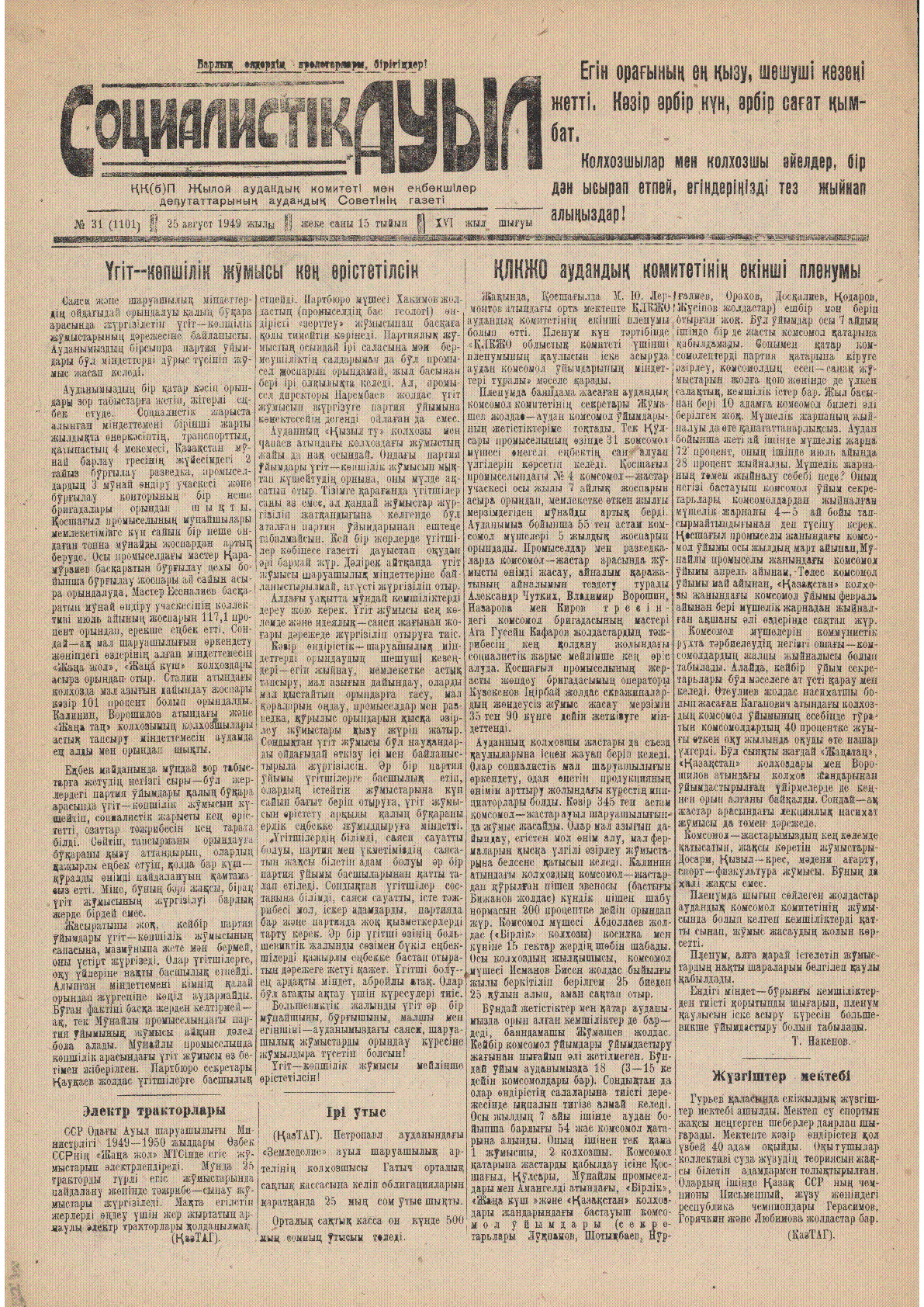 Социалистік ауыл [Мәтін]. – Гурьев облысы : "Социалистік ауыл" газетінің баспаханасы, 1949. - .– 1350 дана. 1949. - 25 август. - №31 (1101). - 1350 дана