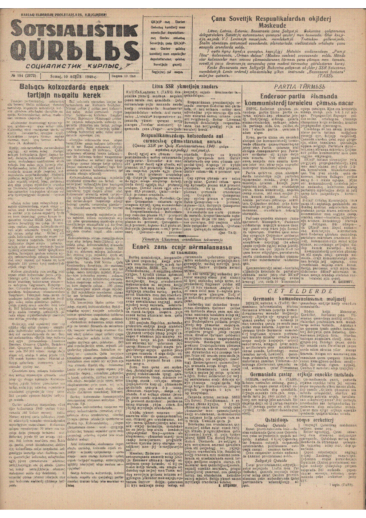 Социалистік құрылыс [Мәтін] / Жауапты редактордың орынбасары: С. Сауырғалиев. – Гурьев, 1940. - .– 8000 дана. 1940. - 10 август. - №184 (2072). - 8000 дана