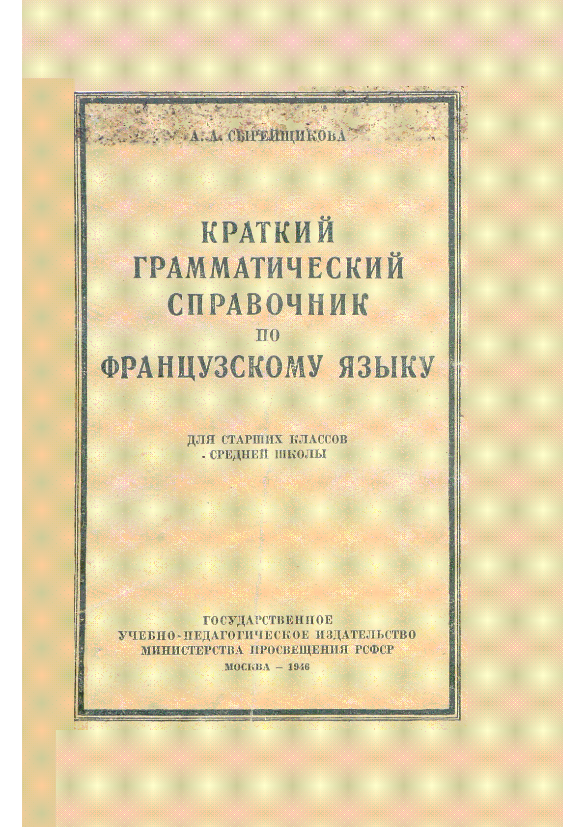 Краткий грамматический справочник по французскому языку [Текст] : для старших классов средней школы / А. А. Сырейщикова ; [ред. Е. П. Кутыева]. – Изд. 4-е ., исправ. и доп.. – Москва : Государственное учебно-педагогическое издательство Министерства Просвещения РСФСР, 1946. - 202, [2] с. - Шора Сарыбаев қоры . . – 35000 экз. : 0 тг.